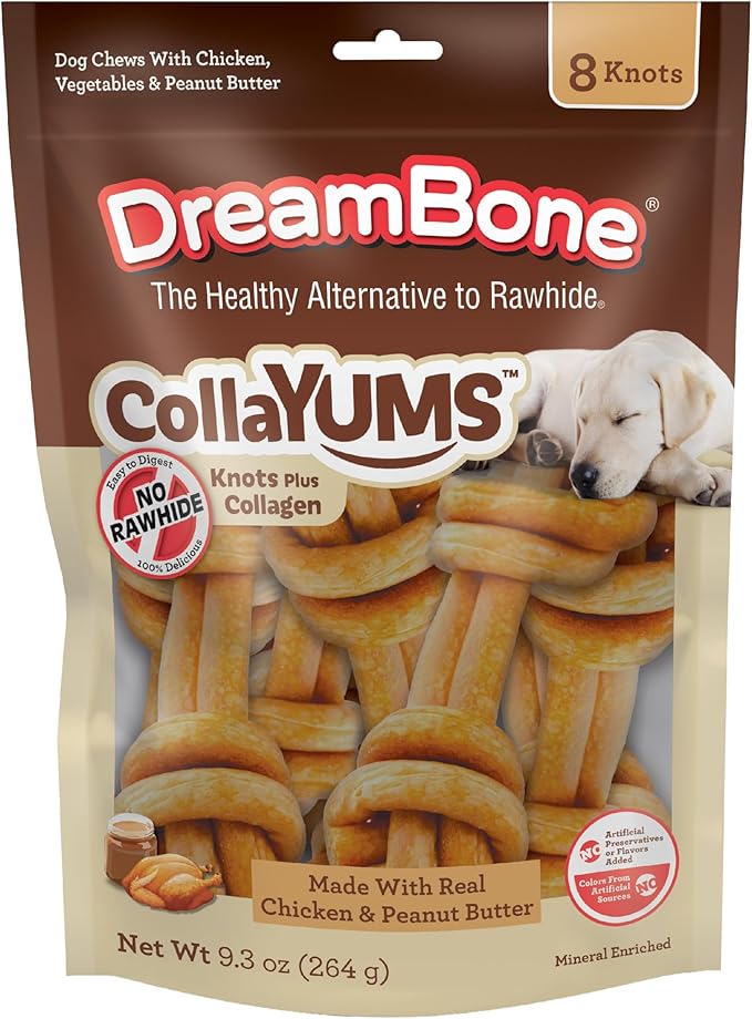 DreamBone CollaYUMS Knots Plus Collagen Chews for Dogs, 8 Count, Treat Your Dog to Rawhide-Free Chews Made with Chicken, Vegetables and Peanut Butter