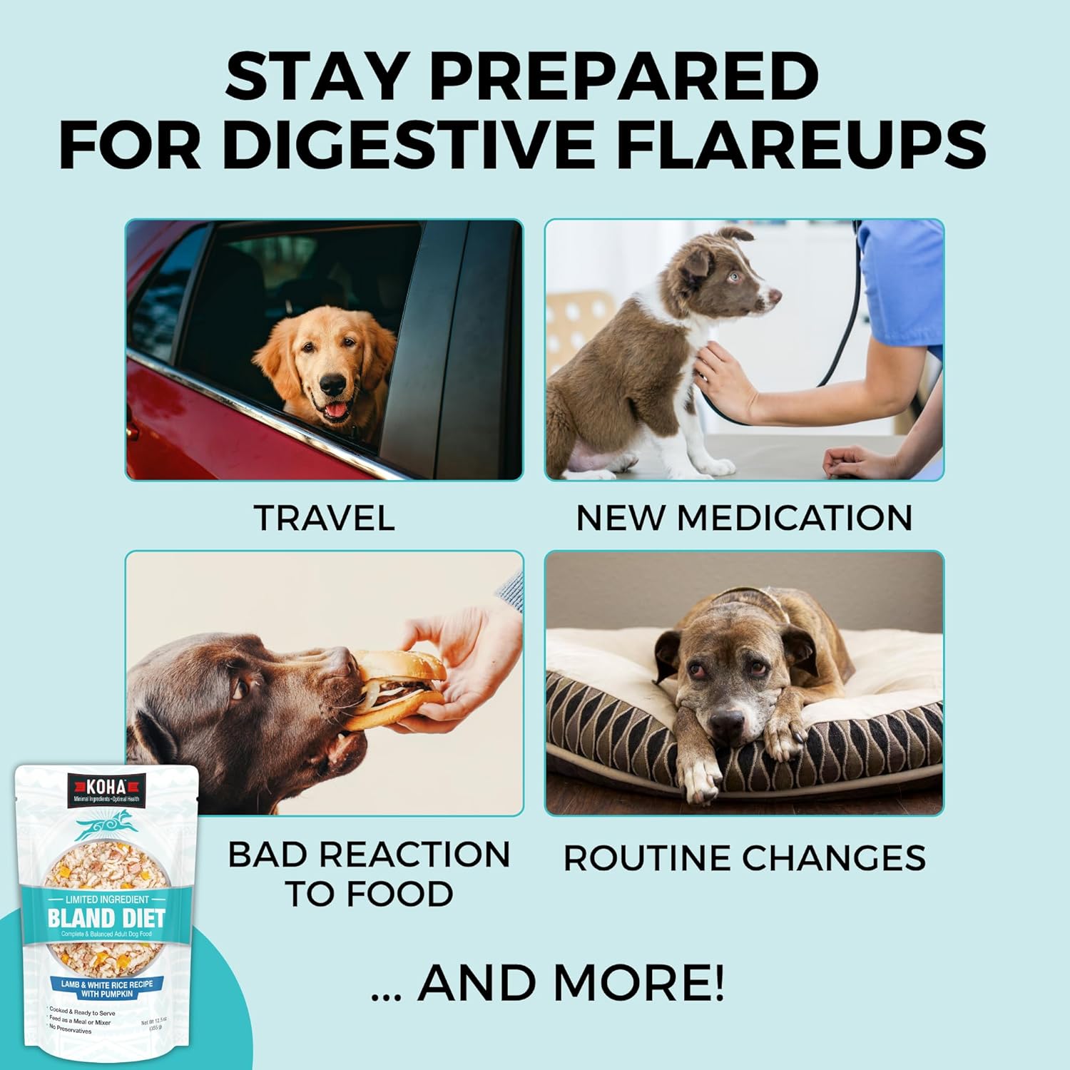 - FOR CHRONIC UPSET STOMACH OR FLAREUPS: Whether your dog suffers from chronic digestive issues, or is experiencing a flareup from things like stress, medication, or travel, KOHA Bland Diet can be fed to help get their tummy back on track!