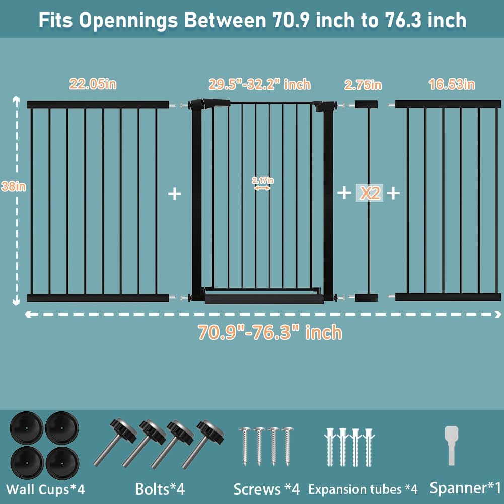 Fairy Baby Extra Tall Baby Gate Stand 38" Tall, 70.9"-76.3" Extra Wide Large Safety Child Gates for Doorway, Metal Auto Close Dog Gate for House, Stair Gates for Kids or Pets No Drilling, Black