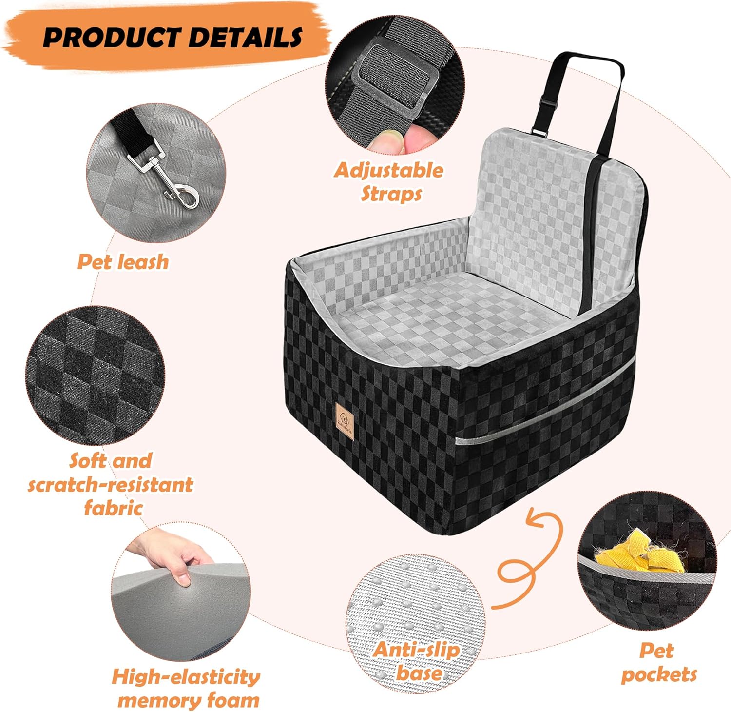 Dog Car Seat for Small and Medium Dogs Up to 35 lbs –Memory Foam Dog Booster Seat with Safety Leash & Storage Pockets, Fits Front & Back Car Seats, Removable Washable Cover - Black & Gray