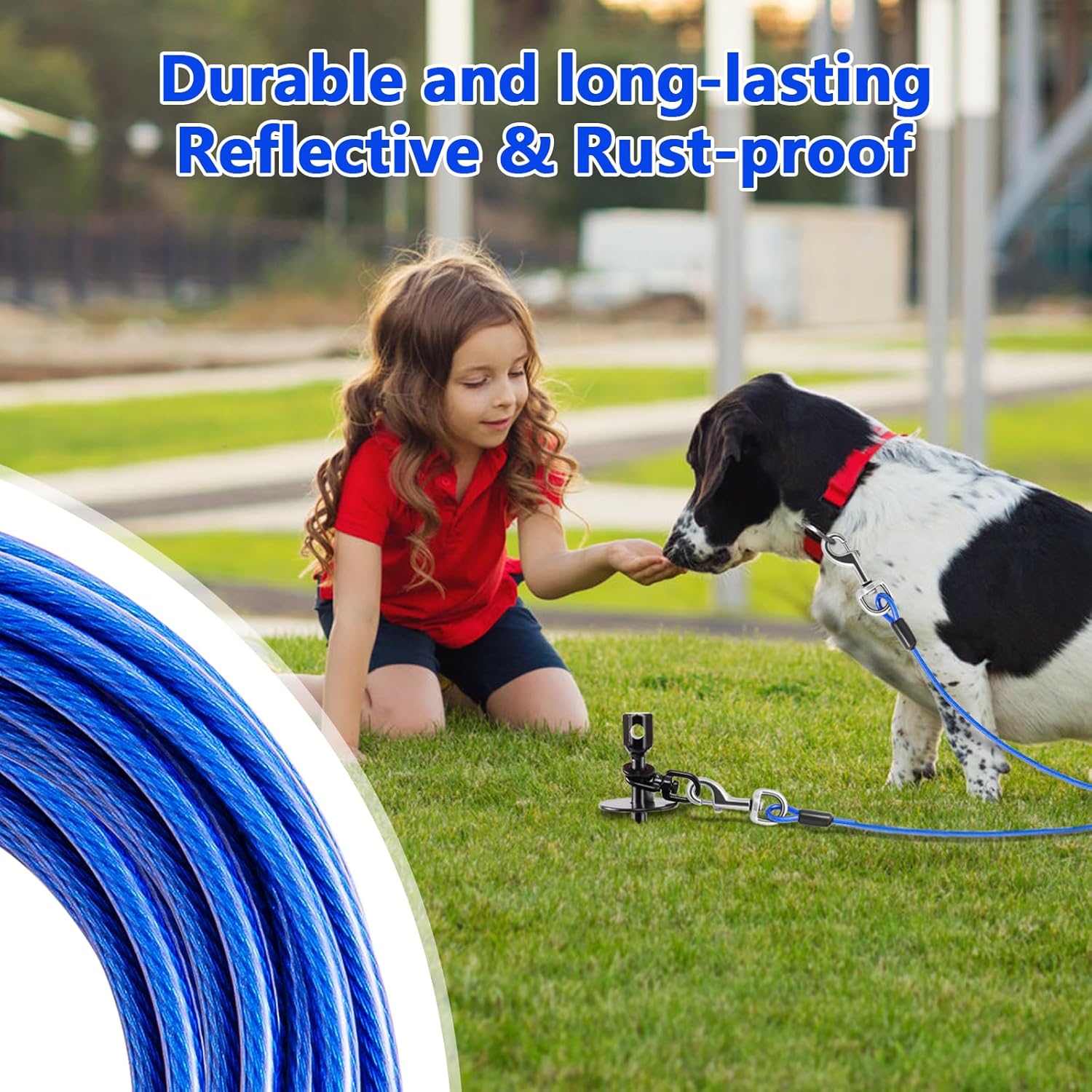 - Chew Proof Dog Leash: The durable dog tie out cable is made of a sturdy steel wire core and a chew resistant transparent PVC coating. This dog leash is rust resistant and durable. The safety lock hook ensures safety in any environment, whether in the yard, camping, or during outdoor training. It is perfect as a long training leads line or fixed tie-out, giving your dog the freedom to explore while keeping them safely under control.