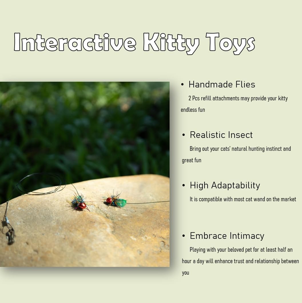 Cat Feather Toys - 2 Pcs Handmade Simulation Flies – Durable Cat Toy Wand Refills - Interactive Kitten Teaser Wand Attachments - Cat Toys Replacement for Cat Kitten Wand