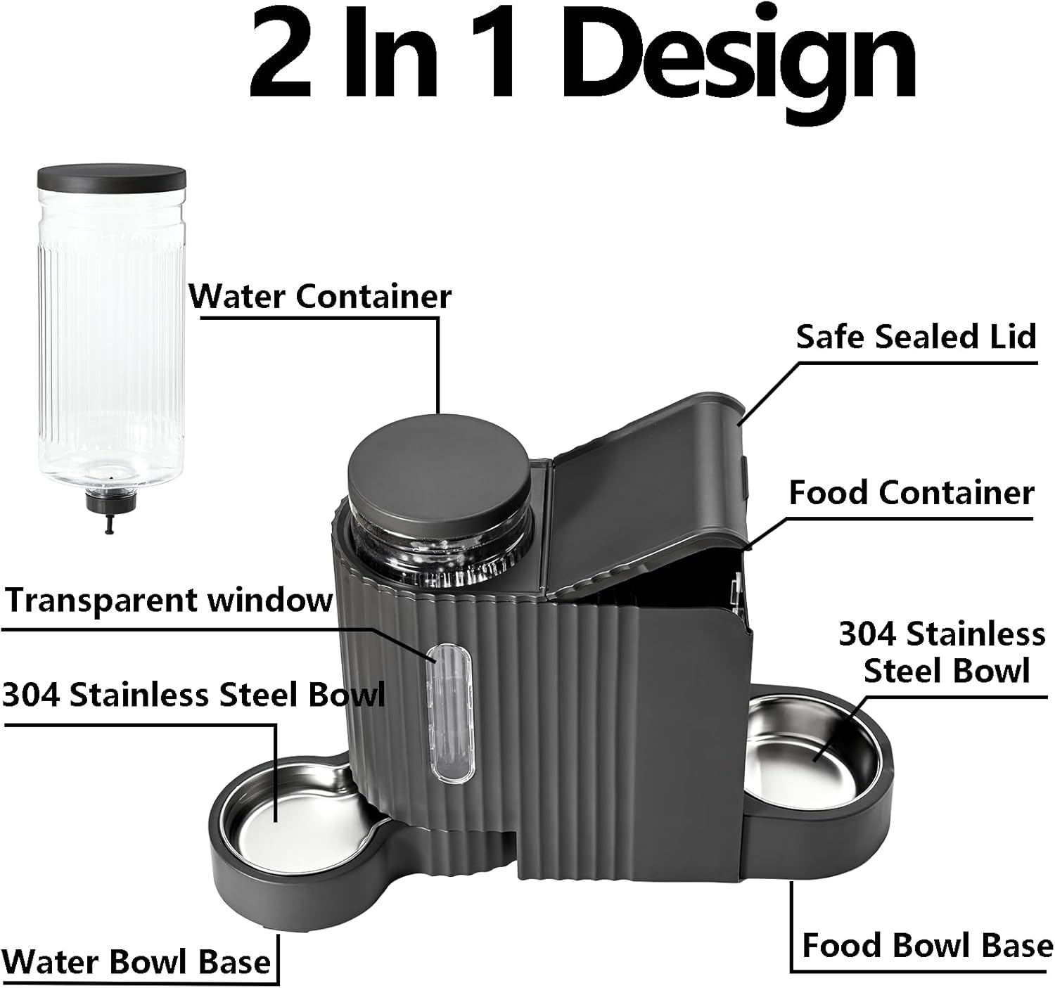- 2 in1 New Design Automatic Cat Feeder and Water:Gravity automatic cat and dog food feeder and water dispenser set with stainless steel bowl,The bottom of the cat feeder has been upgraded with a movable stainless steel bowl to keep food fresher and easy to clean, not easily deformed, not rusty,sturdy and sanitary. Our automatic cat feeder and water system combines a gravity cat feeder and water dispenser, offering busy pet owners an efficient way to ensure their furry friends have consistent access to food and hydration