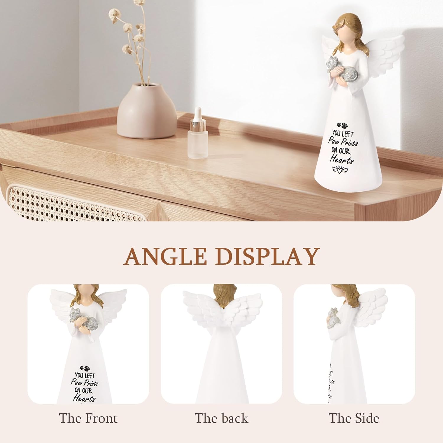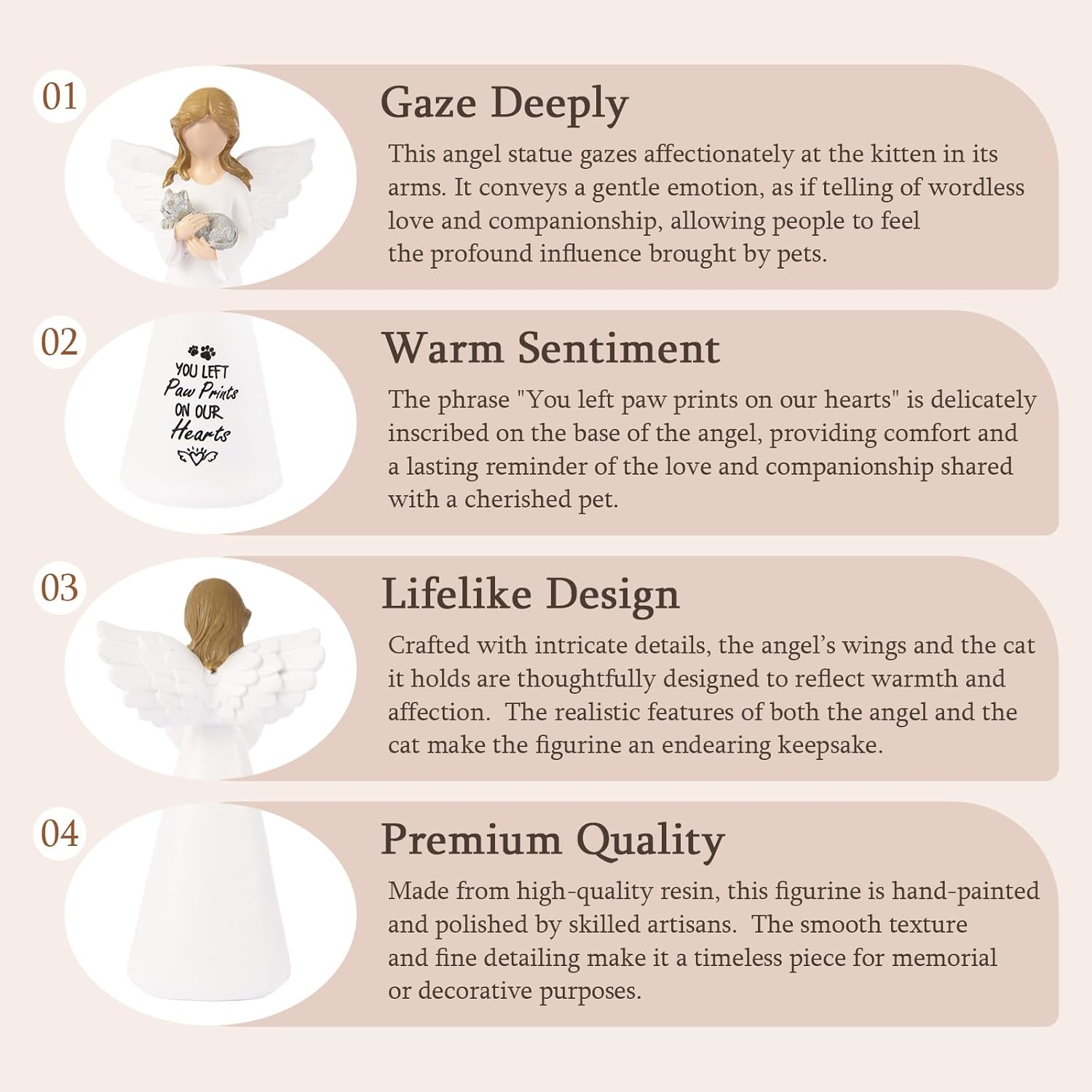 - Cat Memorial Gifts: This beautifully crafted angel figurine holding a cat symbolizes the loving bond between a pet and its owner. A perfect memorial to honor a beloved cat that has passed. The heartfelt message, "You left Paw Prints on Our Hearts," adds a special touch to this loss tribute.