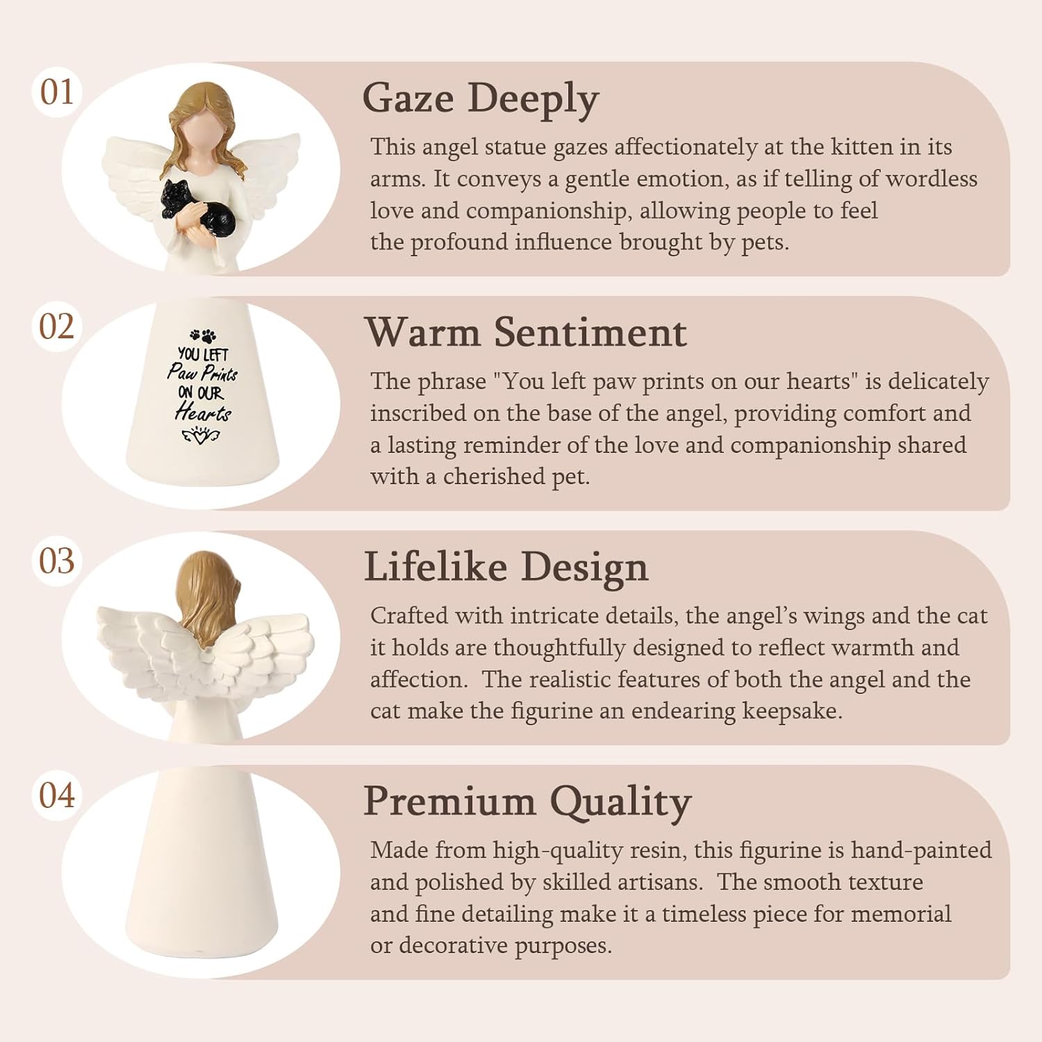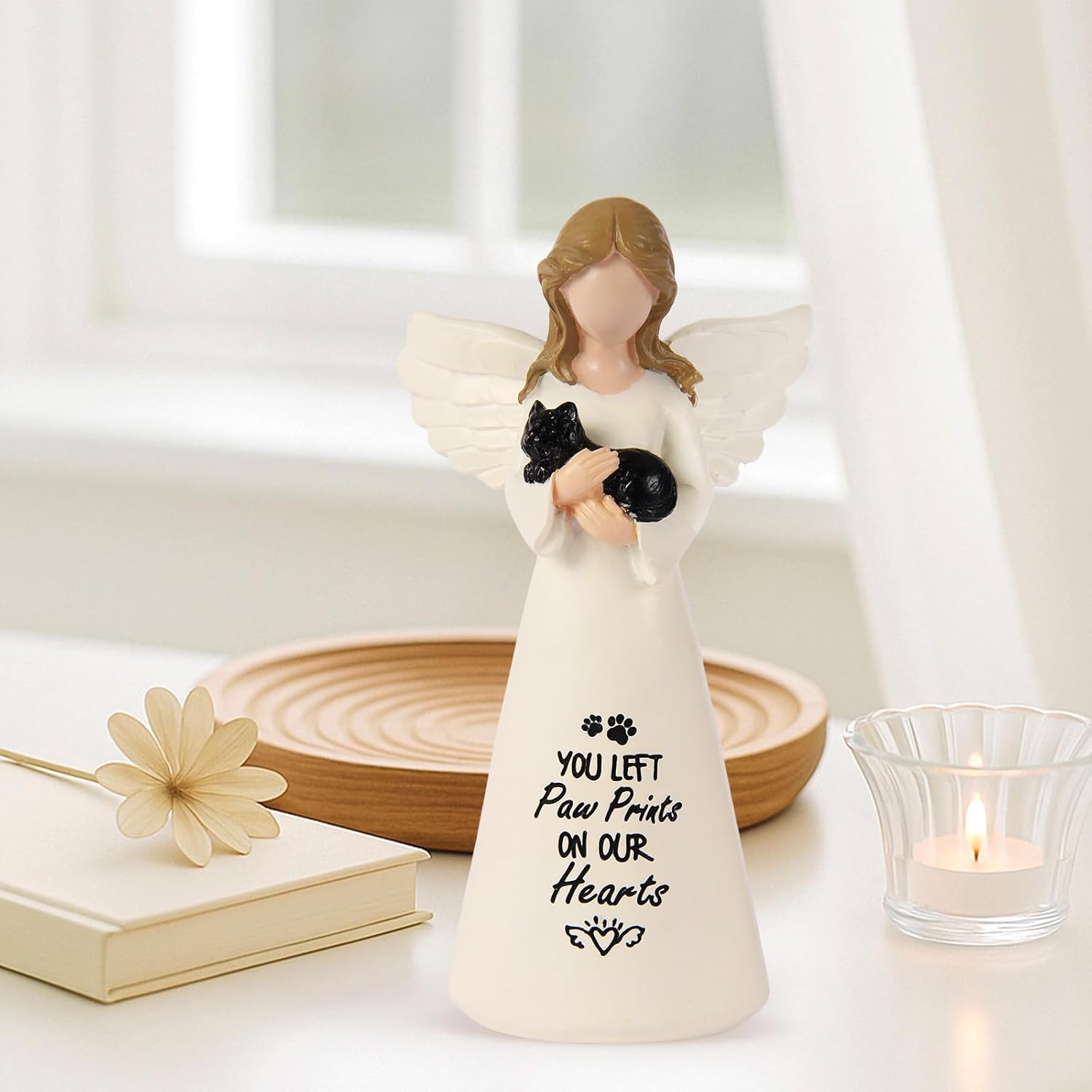 - Cat Memorial Gifts: This beautifully crafted angel figurine holding a cat symbolizes the loving bond between a pet and its owner. A perfect memorial to honor a beloved cat that has passed. The heartfelt message, "You left Paw Prints on Our Hearts," adds a special touch to this loss tribute.