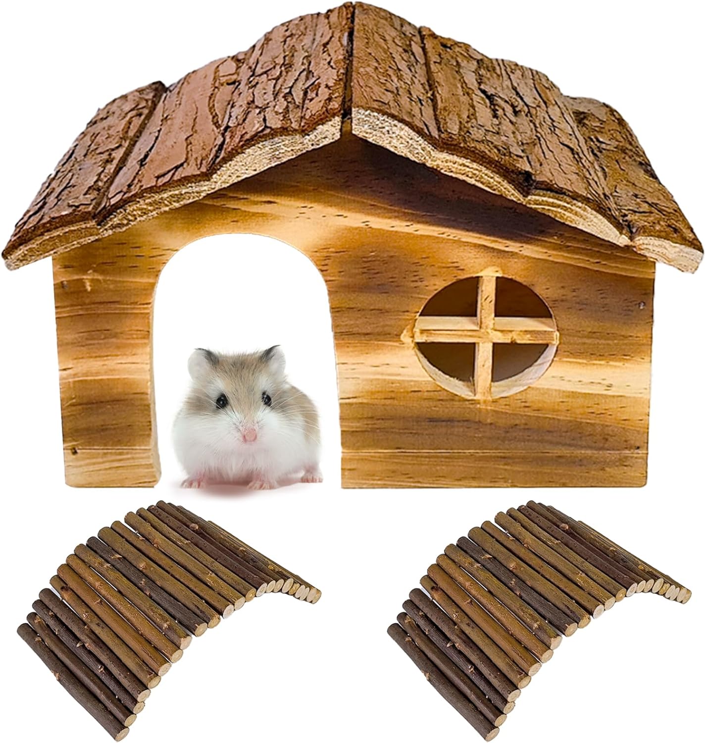 - Hamster House Set : The hamster house hut set includes 1 hamster house and 2 wooden bridges. Suitable for dwarf hamster, Syria hamster, mouse and other small rodents