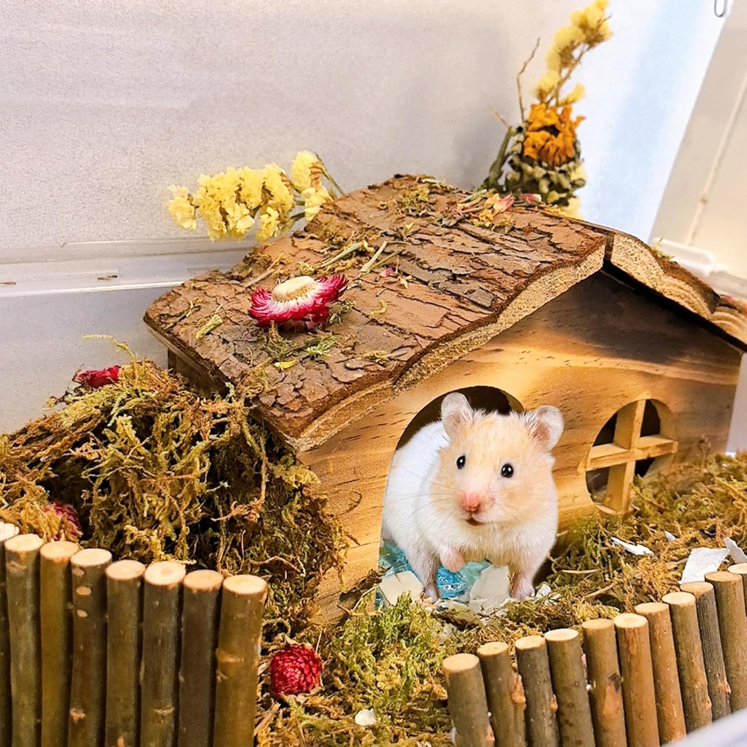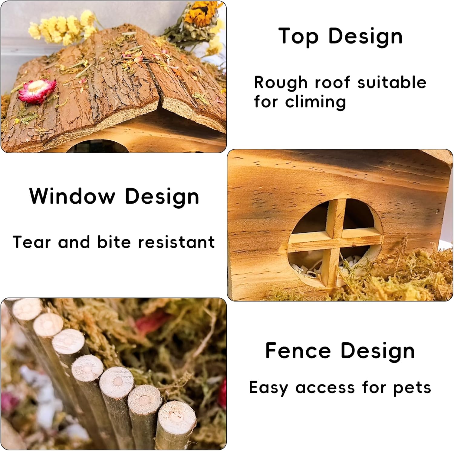 - Excellent habitat for hamsters : Hamster Hut provides a place for your furry friends to hide, play and rest. The natural bark appearance of the cabin gives pets a sense of security, satisfies their instinct to explore, and reduces boredom and loneliness