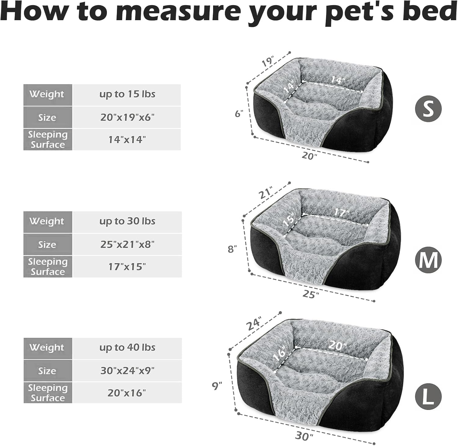 - 🐶Size Details: Small dog bed for Small dogs up to 15lbs, the outer size is 20"x19"x6"; Medium dog bed for Medium dogs up to 30lbs, the outer size is 25"x21"x8"; Large dog bed for Large dogs up to 40lbs, the outer size is 30"x24"x9"; X-Large dog bed for Jumbo dogs up to 60lbs, the outer size is 35"x25"x9"; XXL dog bed for Large dogs up to 80lbs, the outer size is 42"x30"x10"; Please be sure to confirm the size.
