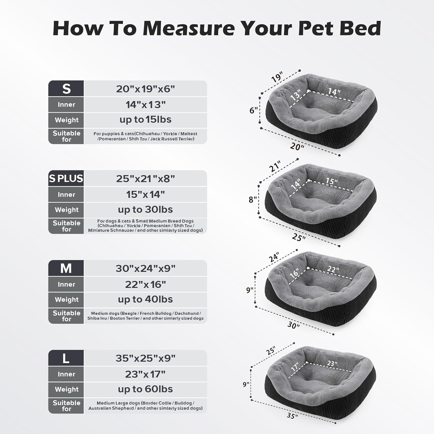 - 🐶SIZE DETAILS: Small dog bed for Small dogs or cats up to 15lbs, the outer size is 20"x19"x6"; Small Medium dog bed for pets up to 30lbs, the outer size is 25"x21"x8"; Medium dog bed for Medium dogs up to 40lbs, the outer size is 30"x24"x9"; Large dog bed for large dogs up to 60lbs, the outer size is 35"x25"x9"; Please be sure to confirm the size.