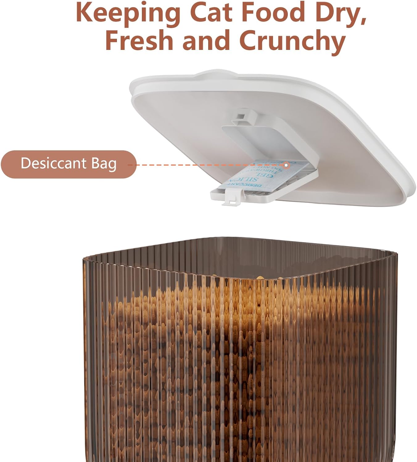 - Lock Freshness: Our automatic feeder for cats with desiccant pouch and seal to keep food fresh. Desiccant bag on lid keeps moisture out and cat food fresh. The button design on the screen effectively prevents cats from accidentally touching it