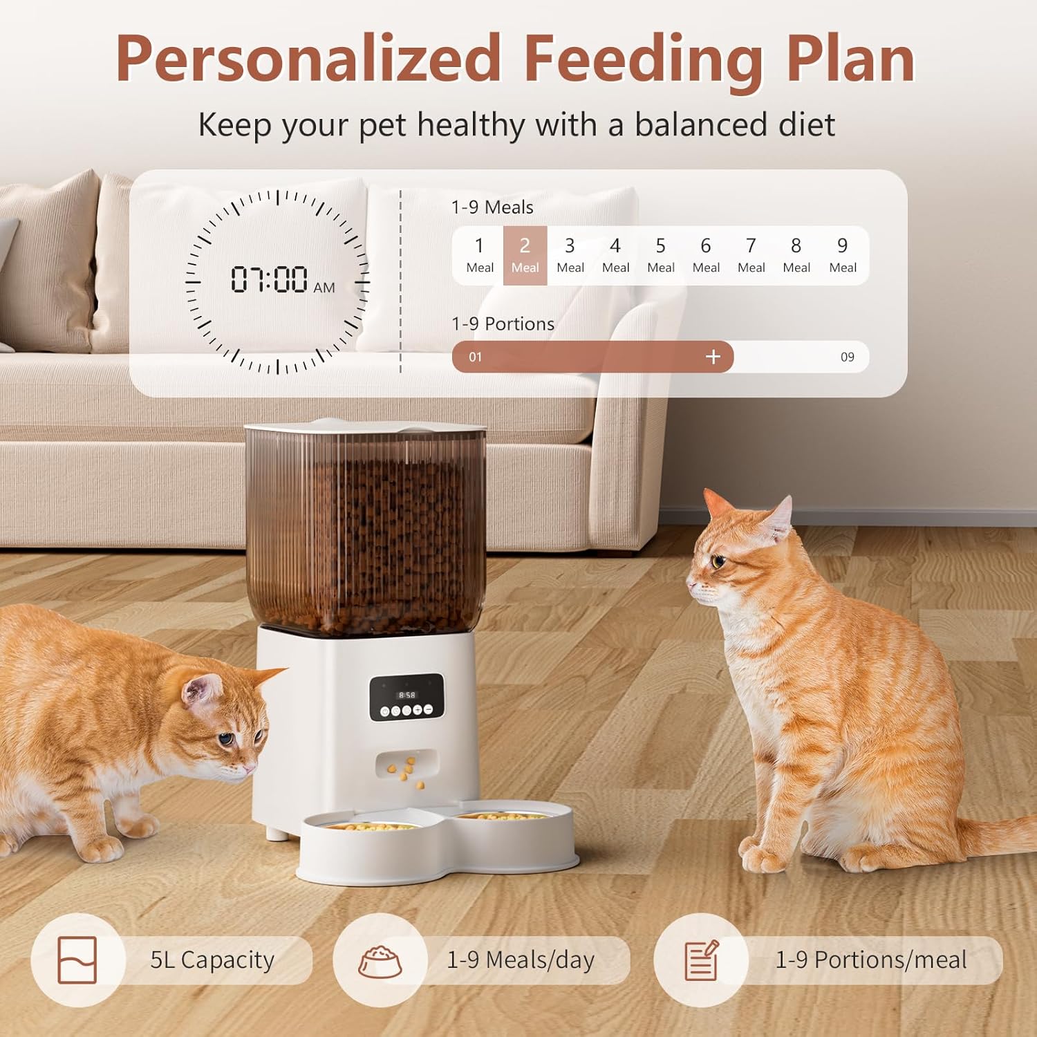 - 5L Capacity Storage: This automatic dog feeder with timer can store up to 5L of food, which reduces the frequency you have to add food. The automatic cat food bowl is easy to clean and reduces germ growth