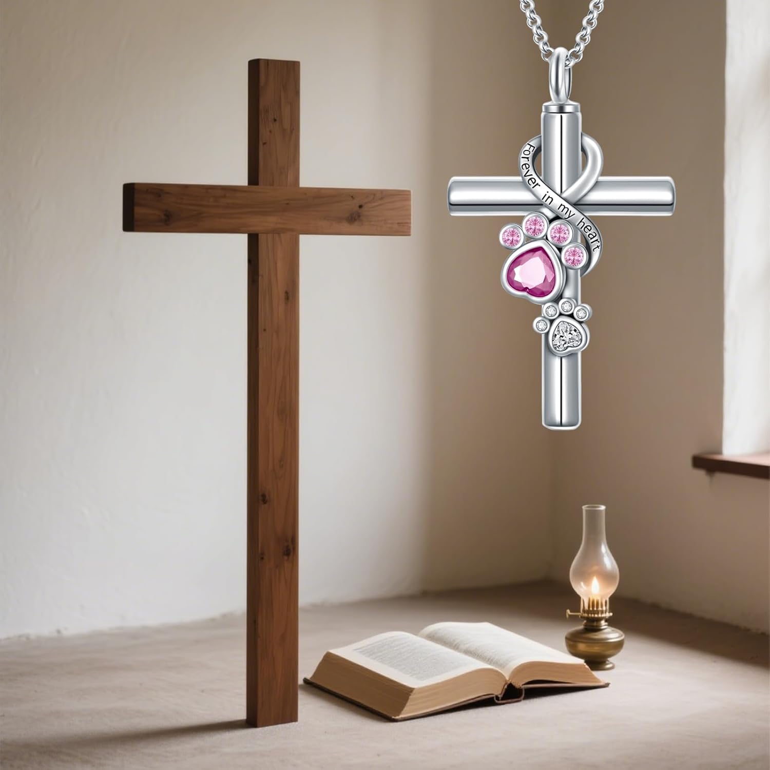 - Pet Ashes Pendant: The urn locket uses the design of a cross with pink and white paw prints, and the cross symbolizes faith, love and hope.Engraved with "Forever in My Heart" to express how much you miss your pets and keep them by your side forever.