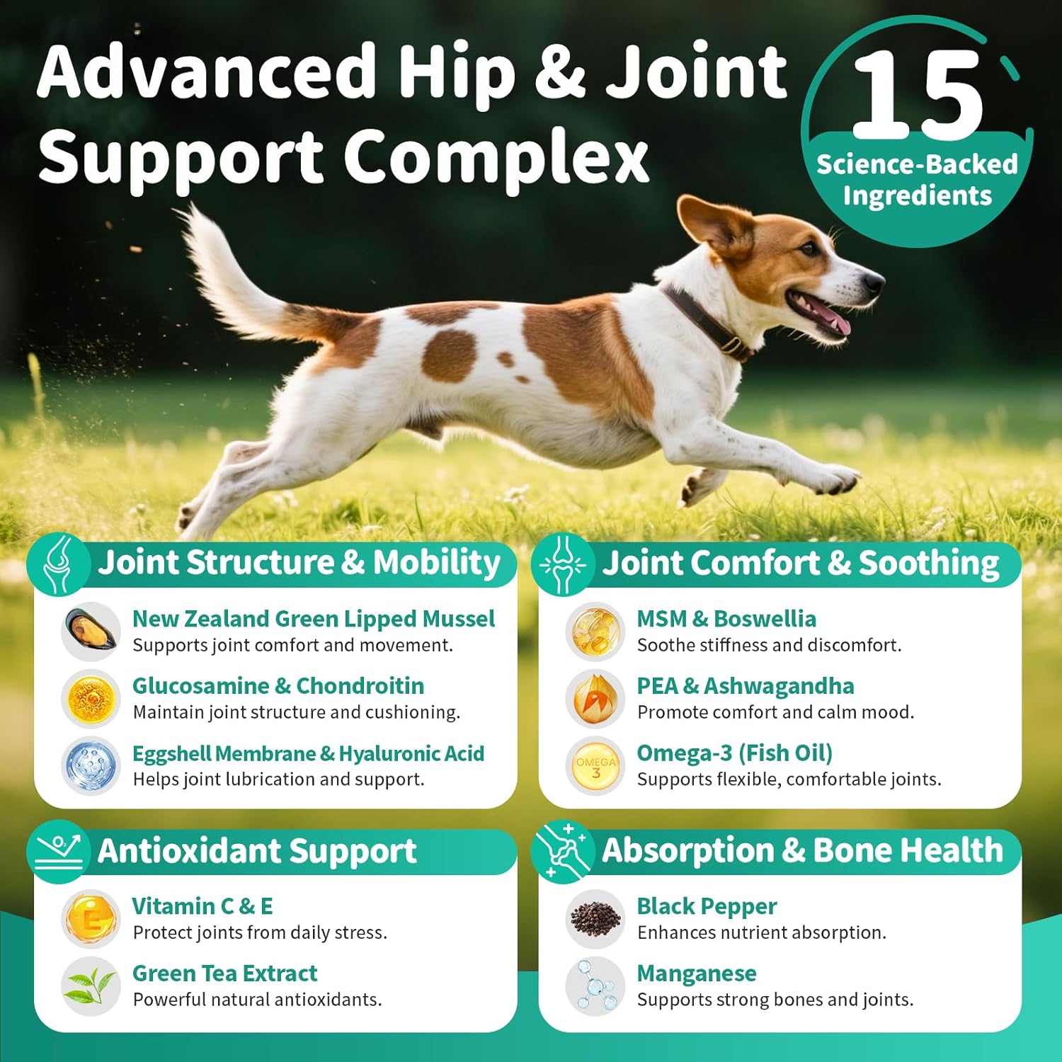 - 15-in-1 Dog Hip and Joint Support: This advanced dog joint supplement blends glucosamine for dogs, chondroitin, MSM, PEA, and New Zealand Green Lipped Mussel (GLM). It supports joint structure, mobility, and overall comfort - ideal for all breeds and sizes