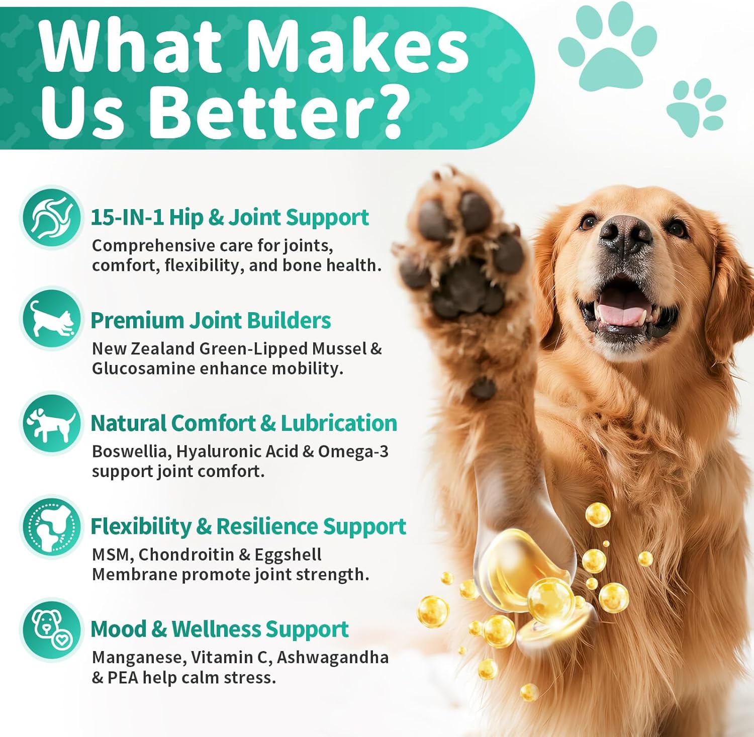 - 15-in-1 Dog Hip and Joint Support: This advanced dog joint supplement blends glucosamine for dogs, chondroitin, MSM, PEA, and New Zealand Green Lipped Mussel (GLM). It supports joint structure, mobility, and overall comfort - ideal for all breeds and sizes
