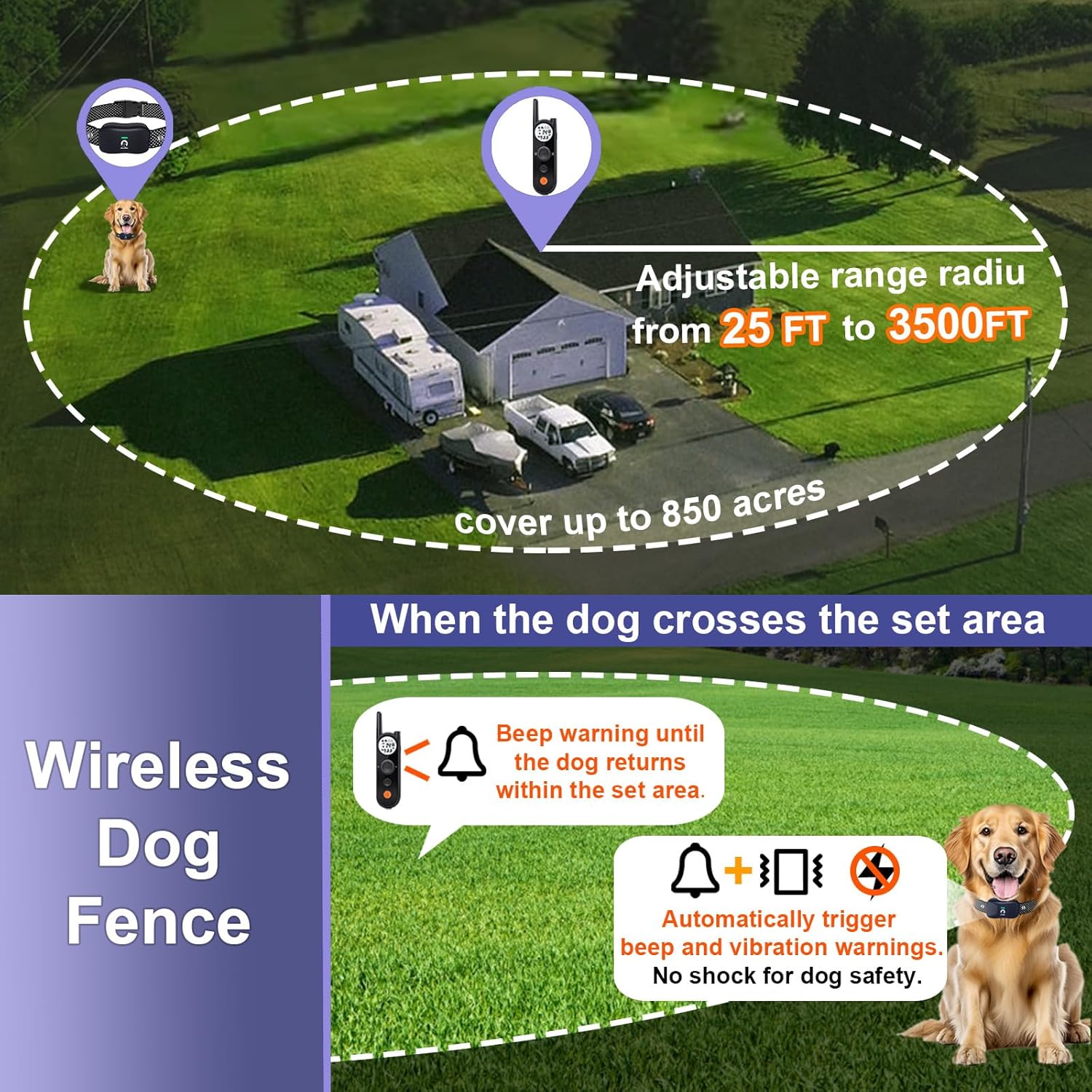 - 【Portable Dog Fence Wireless】The compact design of this wireless pet fence makes it easy to carry and set up wherever you go, giving you the flexibility to create the boundary for your pet at any location. The wireless dog fence system has 14 levels of range adjustable distance from 25 feet to 3500 feet. When the dog crosses the set boundary line, the receiver collar automatically emit warning beep and vibration, alerting the dog to back away.