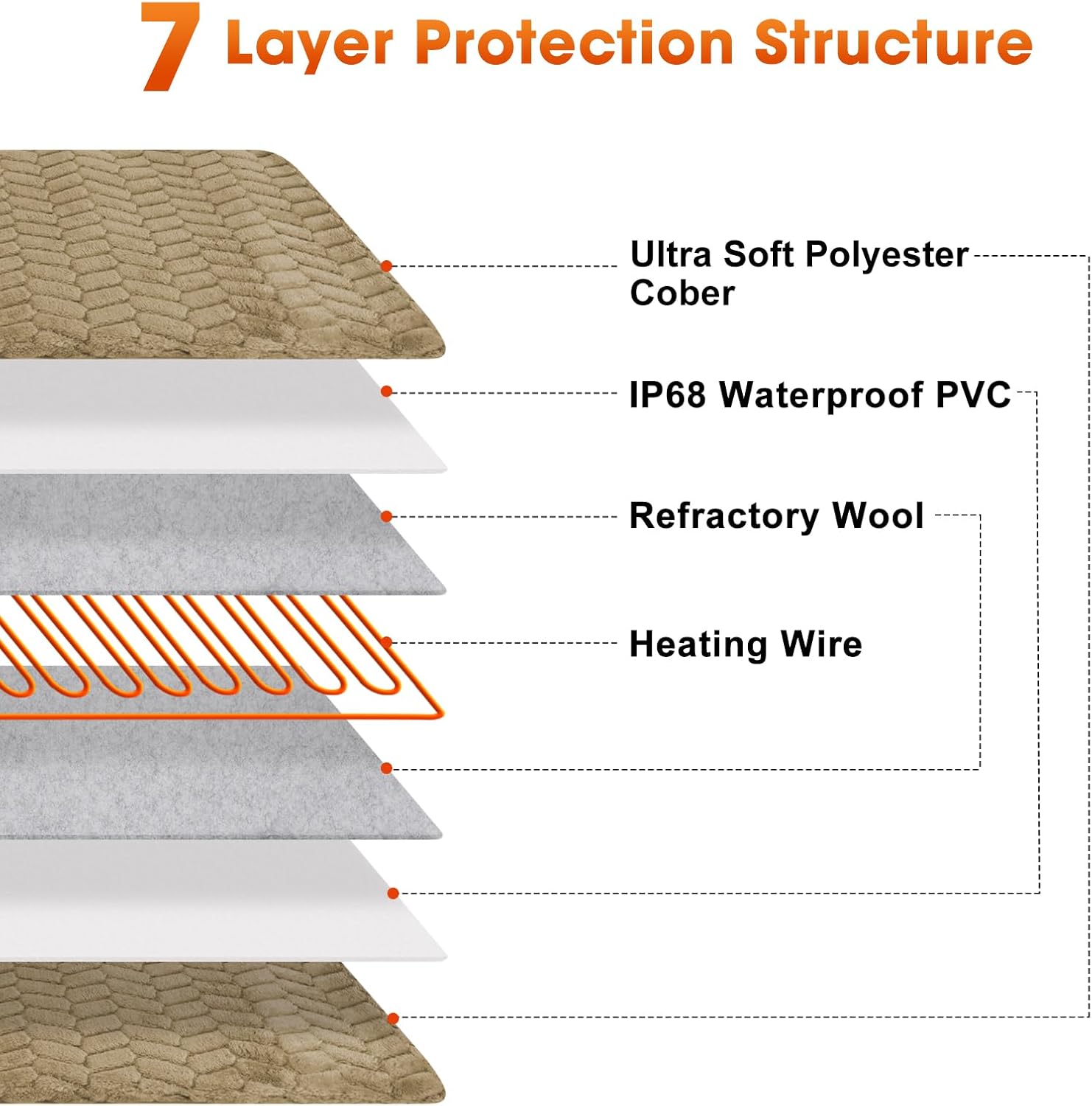- 🐶【7 layer Protective Structure】The pet heating pad is made of soft velvet cover, waterproof PVC enclose, refractory wool and heating wire. Flame Retardant & Waterproof PVC heating pad has the highest-grade V-0 flame retardant capability with UL-certified heating wire to protect pets from burns. The cord is made from chew resistant steel and can protect your pet from electric shocks if it tends to chew on cables.