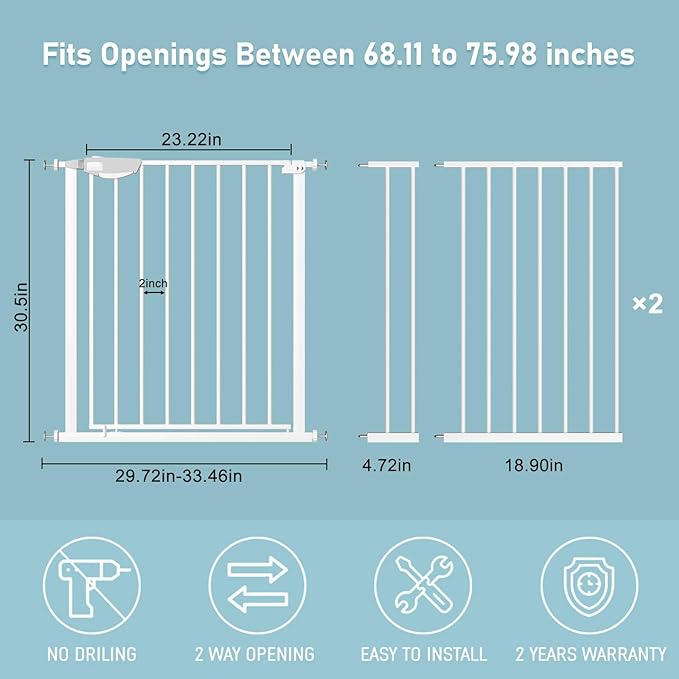 WAOWAO Triple Lock 68.11-75.98" Baby Gate Extra Wide Pressure Mounted Walk Through Swing Auto Close Safety White Metal Dog Pet Puppy for Stairs,Doorways,Kitchen