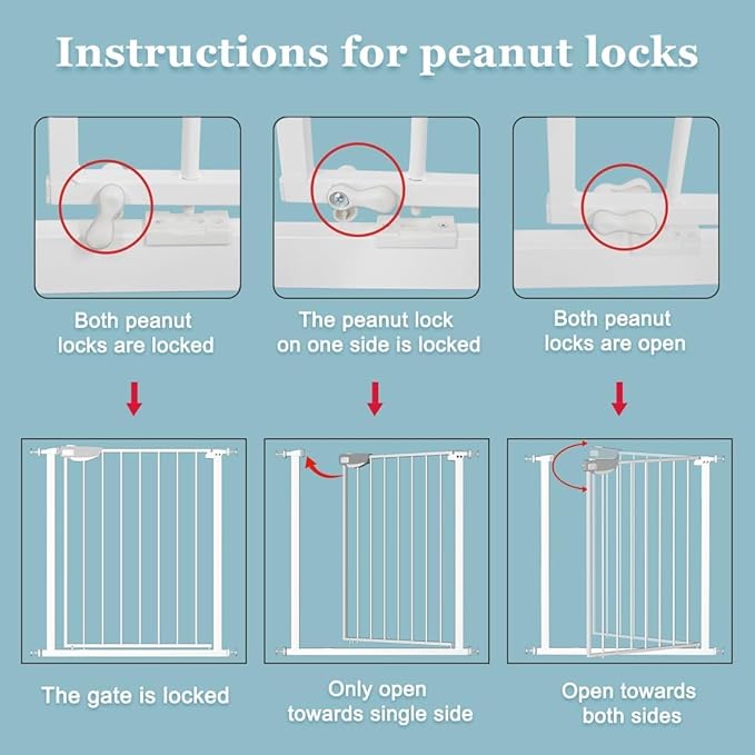 - 【Multiple modes】 Our triple lock gate has various statuses to meet your multiple needs in life. When all three locks are locked, little babies or pets will be stopped by it. At the bottom , there are two peanut locks to control the opening direction and locking. If the peanut lock on one side is locked, the gate can only be opened towards single side. If both peanut locks are open, the gate can swing both ways. Besides, it will stay open at 90 degrees and auto-close when it's less than that