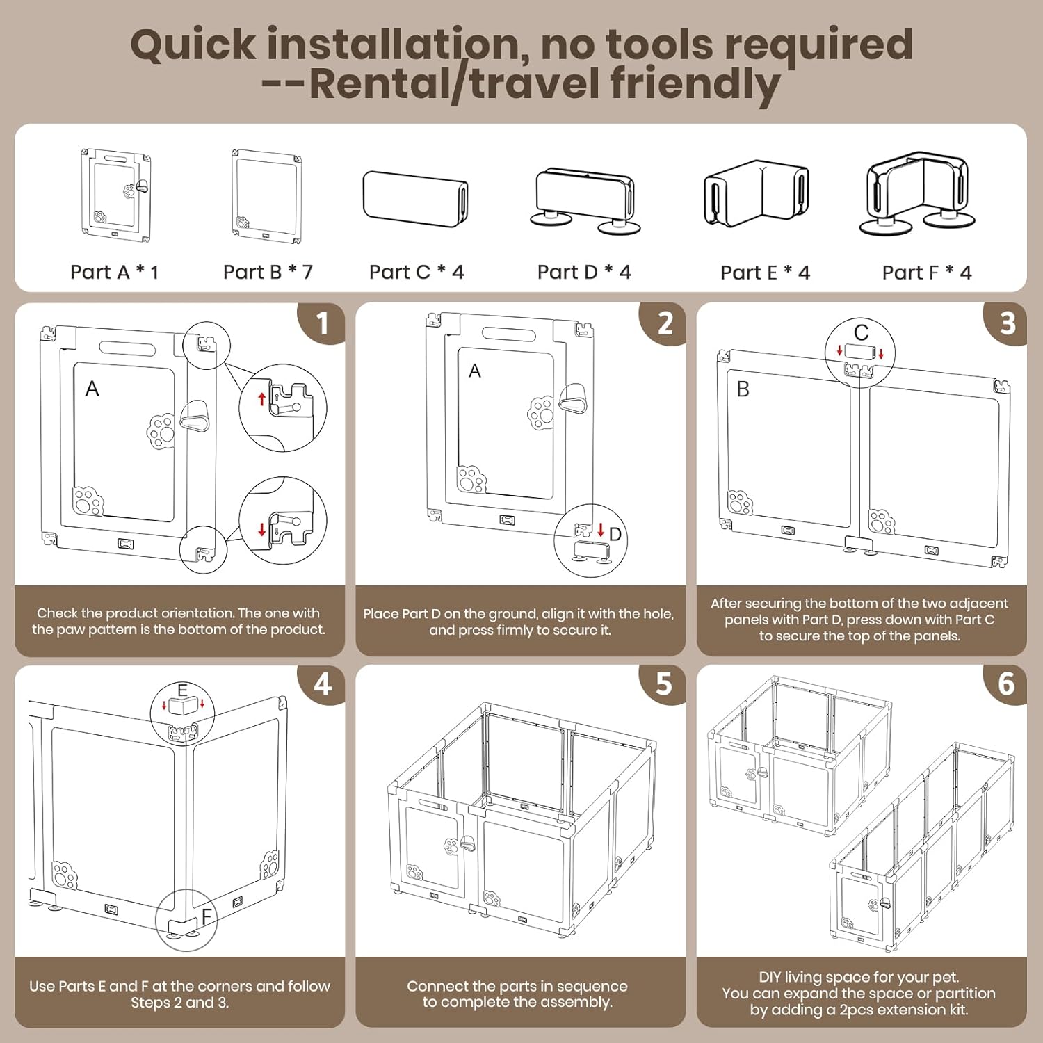 - No tools required: You can complete the entire installation or removal in just 10 minute. No screws or tools required for this puppy play pen for indoors. Portable design(weighs only 1.43lb per panel) makes it easy to move.