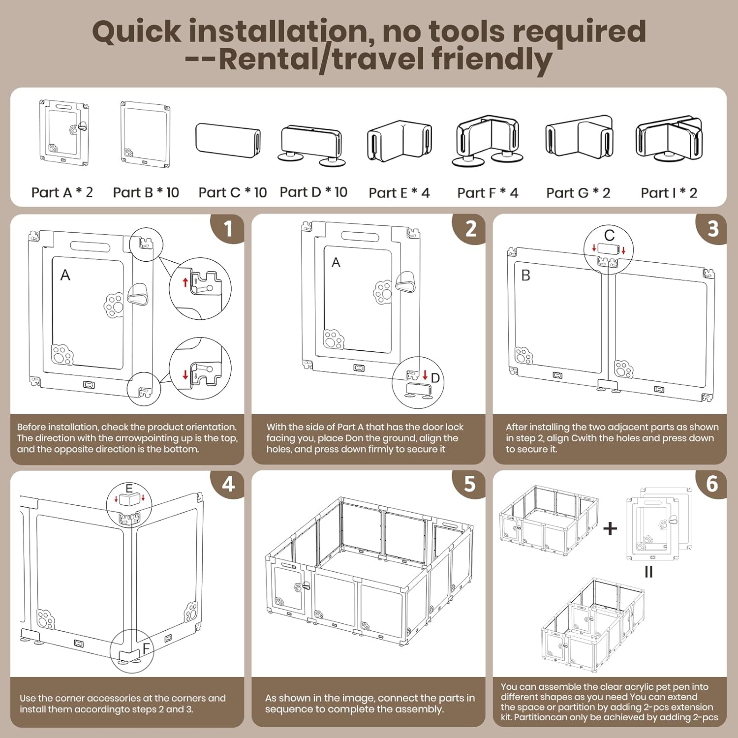 - Grows with Your Pet: Modular and expandable design allows you to start small and expand as needed - start with 8PCS (1m²) puppy pens indoor, then add expansion kits (sold separately) to create a larger play area for adult dogs.