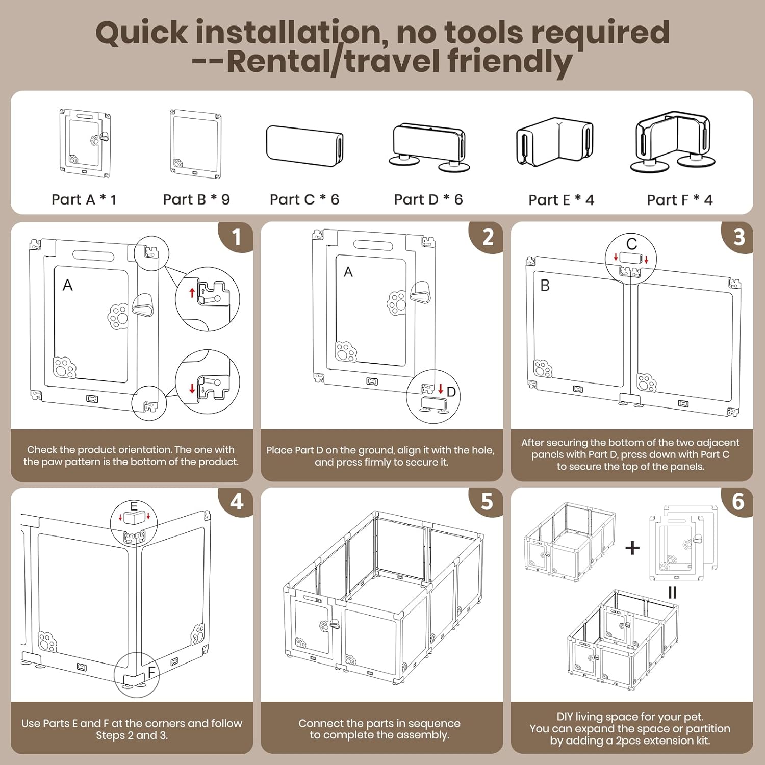 - No tools required: You can complete the entire installation or removal in just 10 minute. No screws or tools required for this puppy play pen for indoors. Portable design(weighs only 1.43lb per panel) makes it easy to move.