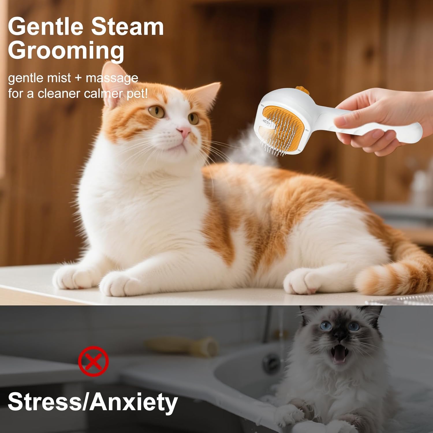 - Cat Steam Brush with One-Click Self-Cleaning Design, Simplifies Cleanup: This pet steam brush features a one-click self-cleaning button. After brushing, press the button to easily remove fur from the bristles, keeping the brush clean and minimizing flying fur. Note: This product is not waterproof. Do not add water directly; please use the included empty bottle for refilling.
