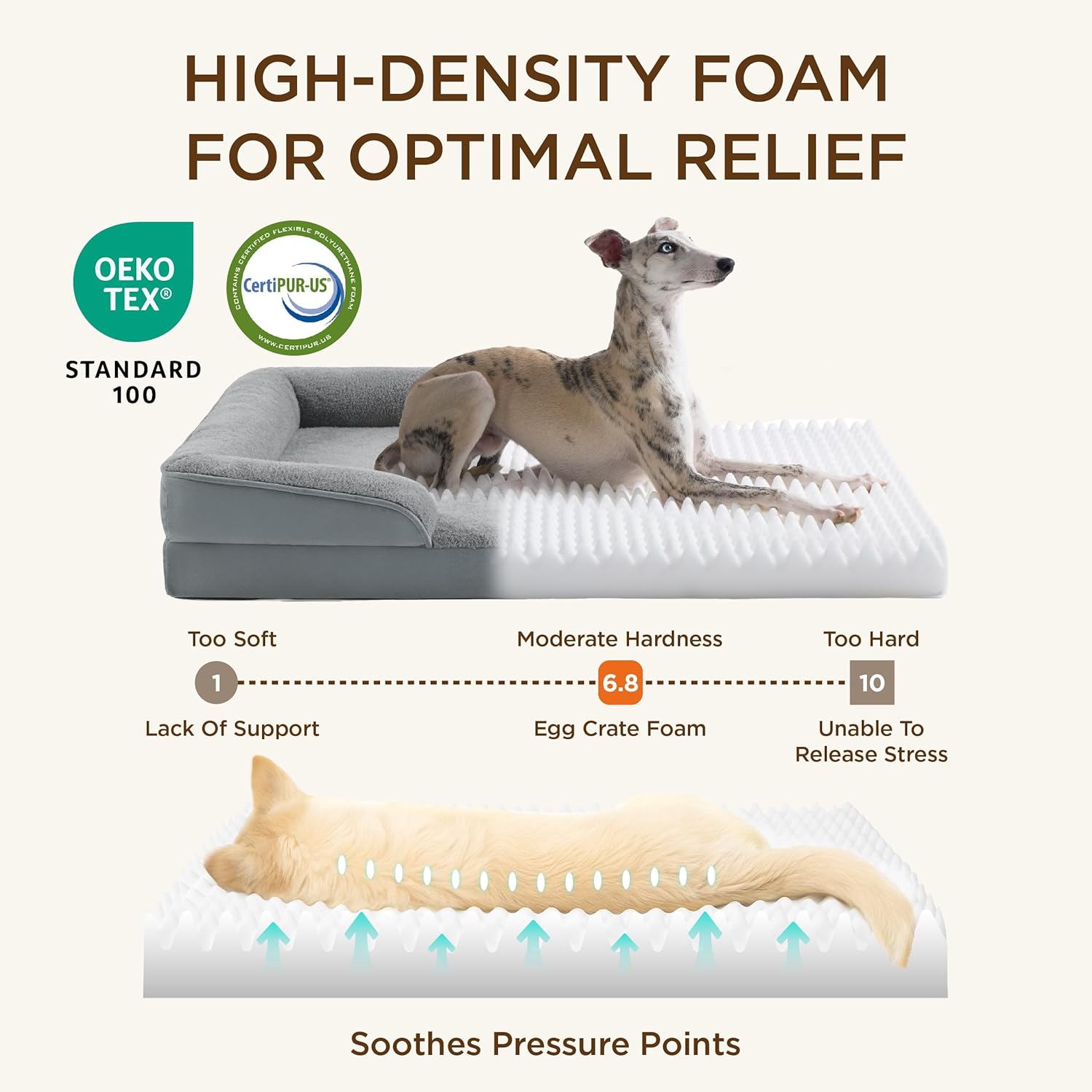 - Orthopedic Support: Our orthopedic dog sofa is designed to give your pet unparalleled support for a deep, dreamy sleep. High-density egg-crate foam helps distribute weight evenly and provides the perfect amount of pressure relief and joint support.