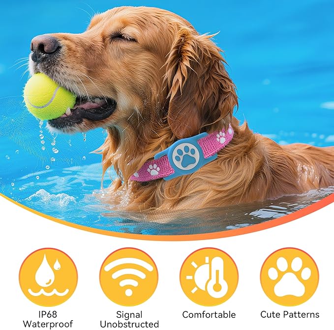 - IP68 waterproof: Premium waterproof capabilities,effectively resisting rain, splashes, and even immersion when dog play in water—no need to worry about water damage your air tag.
