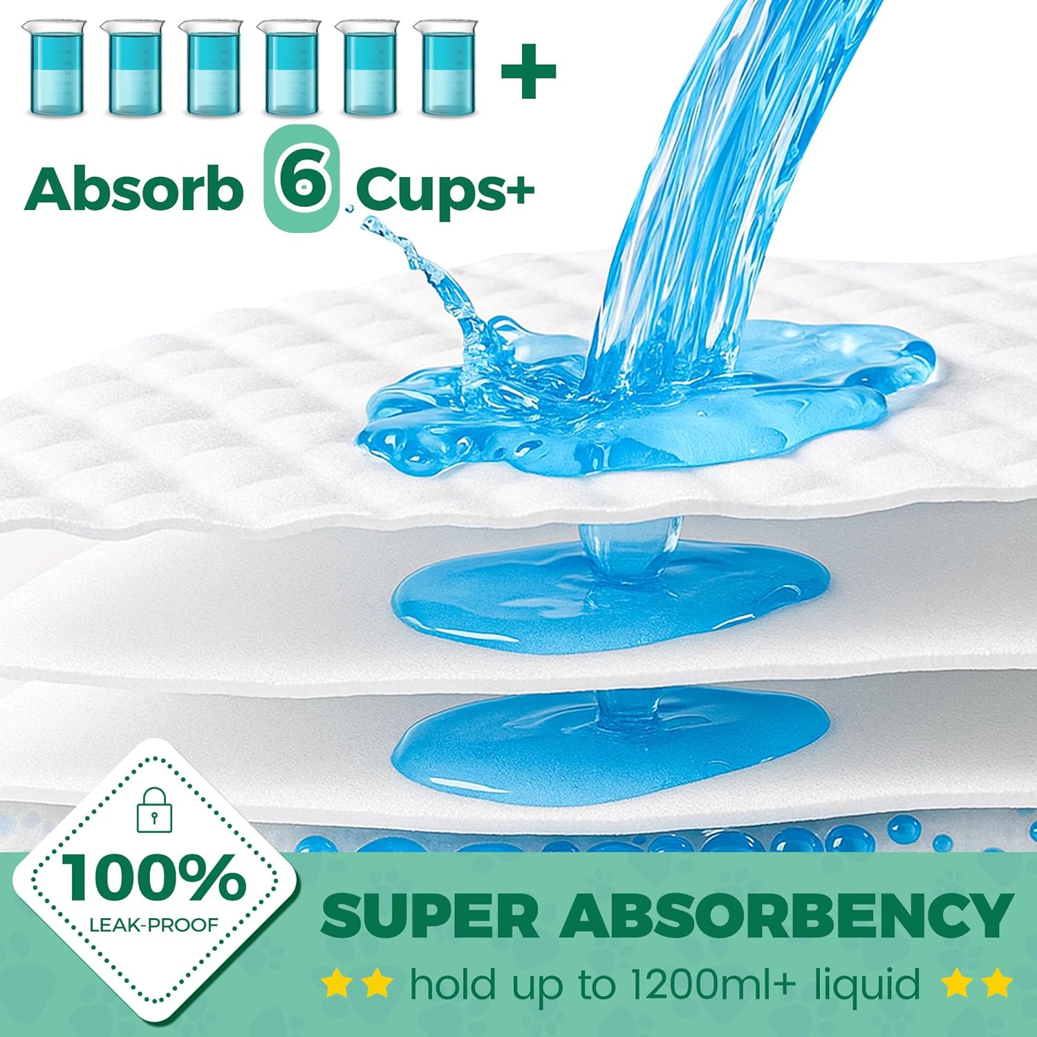 - Super Absorbent Puppy Pads: Large disposable dog pee pads with super absorbent polymer(SAP) technology are more absorbent than previous puppy potty pads, the water absorption capacity of each dogs training pee pads above 1400 milliliters (hold up to 7 cups or more of liquid)