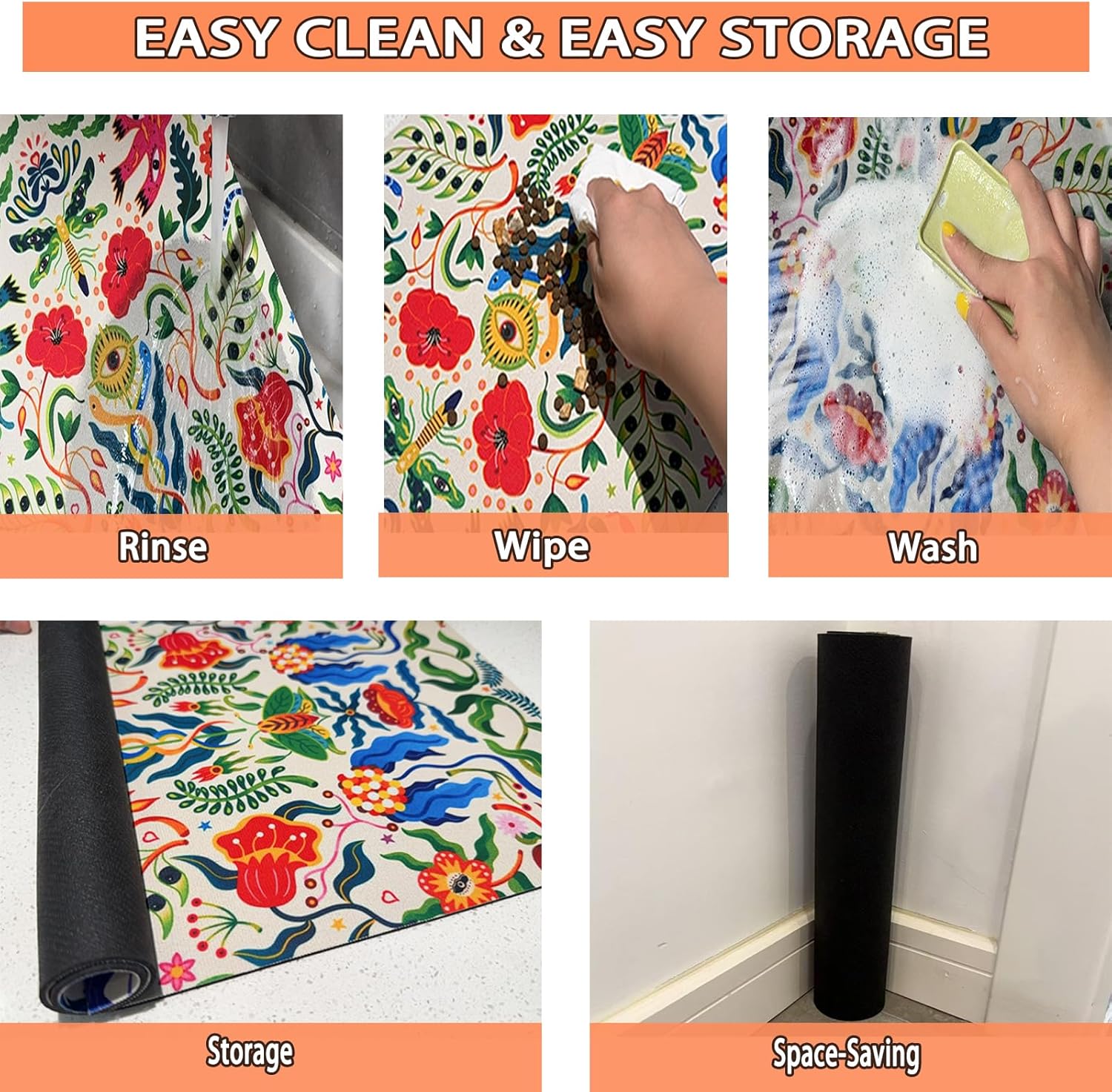 - 【Premium Absorbent Material】Our pet feeding mat features a highly absorbent surface that quickly soaks up spills and drools,It effectively prevents wet paws and keeps your pet's eating area clean.
