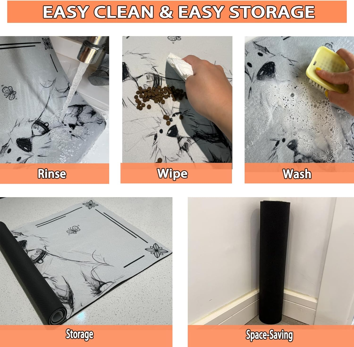 - 【Premium Absorbent Material】Our pet feeding mat features a highly absorbent surface that quickly soaks up spills and drools,It effectively prevents wet paws and keeps your pet's eating area clean.