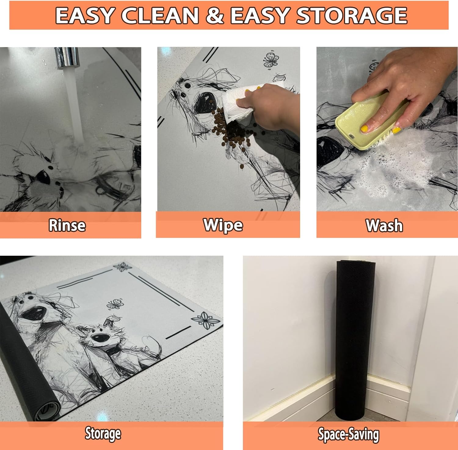 - 【Premium Absorbent Material】Our pet feeding mat features a highly absorbent surface that quickly soaks up spills and drools,It effectively prevents wet paws and keeps your pet's eating area clean.