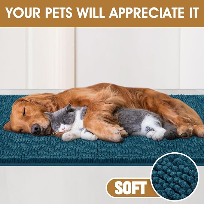 Dog Door Mats for Muddy Paws, Chenille Absorbent Door Mats, Non Slip Heavy Mud Mat for Dogs, Soft Indoor Door Mat for Entryway, Mud Paws, Inside Floor,30" X 20", Teal Blue