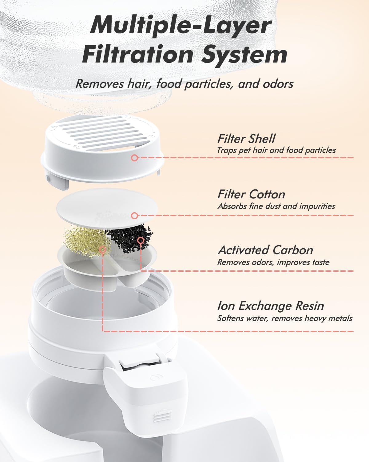 - Multi-Layer Filter for Cleaner Water: Unlike ordinary automatic water dispenser for cats that lack proper filtration, our pet waterer uses a multi-layer outlet filter to absorb impurities, reduce odors, and remove heavy metals. It also blocks dust and pet hair, while the removable, washable filter tray makes cleaning easy, so your pets always enjoy fresh, healthy water