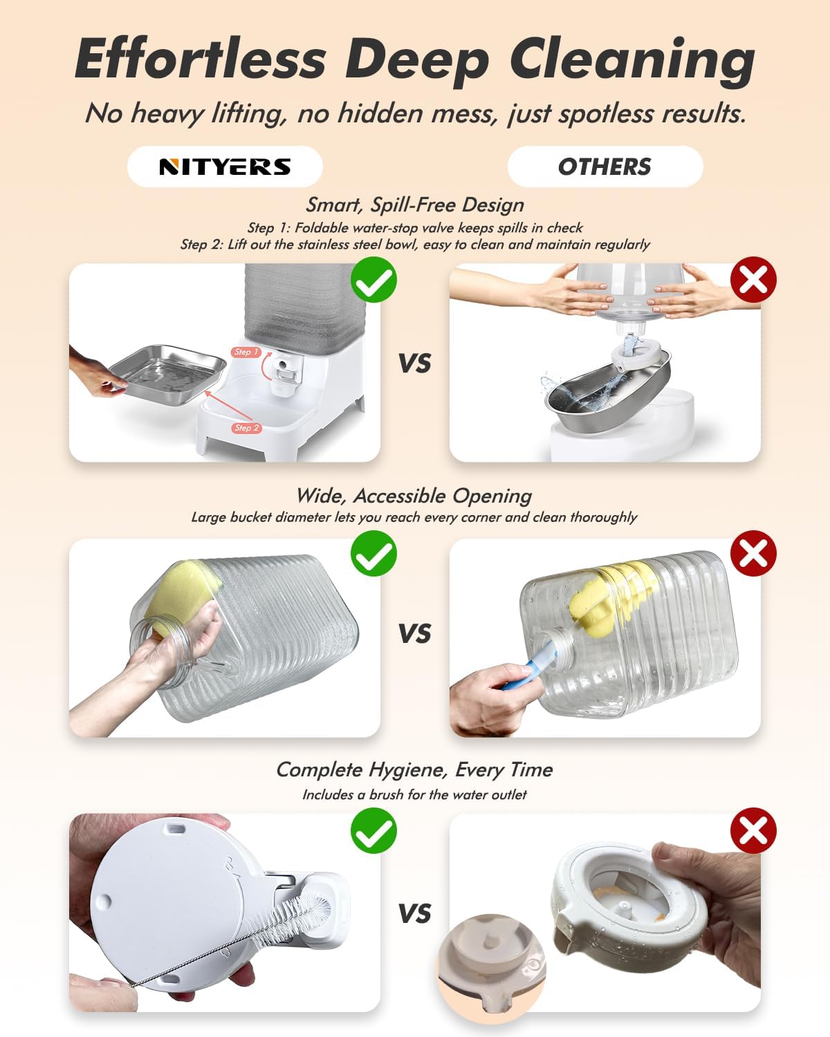 - Lifetime Satisfaction: Endorsed by pet lovers and trusted by households, the Nityers pet water dispenser combines innovative design with durability. As a professional pet supplies manufacturer, we believe high quality and friendly service are our constant aim. We go the extra distance to ensure our automatic pet water dispenser rise above the rest. If an item is found defective within a year, we will issue a replacement. For any questions or concerns, please contact our friendly and professional 24/7 customer support team. **Search “B0DSVHP5LM” to find the matching pet food mat for your Nityers pet waterer