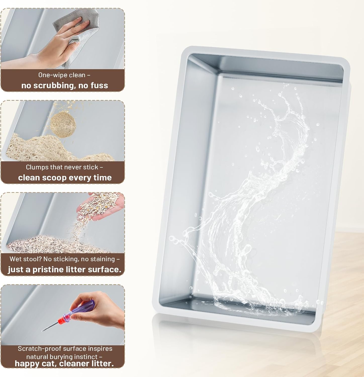 - The Last Litter Box You"ll Ever Need:Tired of replacing plastic boxes? Upgrade to our expanded stainless steel model—immune to odors, stains, and warping for over five years. (Optimized with 20 lbs of litter.)