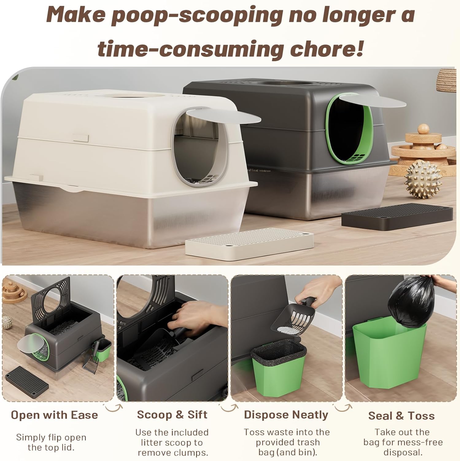 - Clean in 30 Secs, Not 30 Mins:The one-touch locking top lid simplifies daily scooping. Included: litter scooper, mini bin, and biodegradable bags—enabling swift, sealed waste disposal in under 30 seconds.