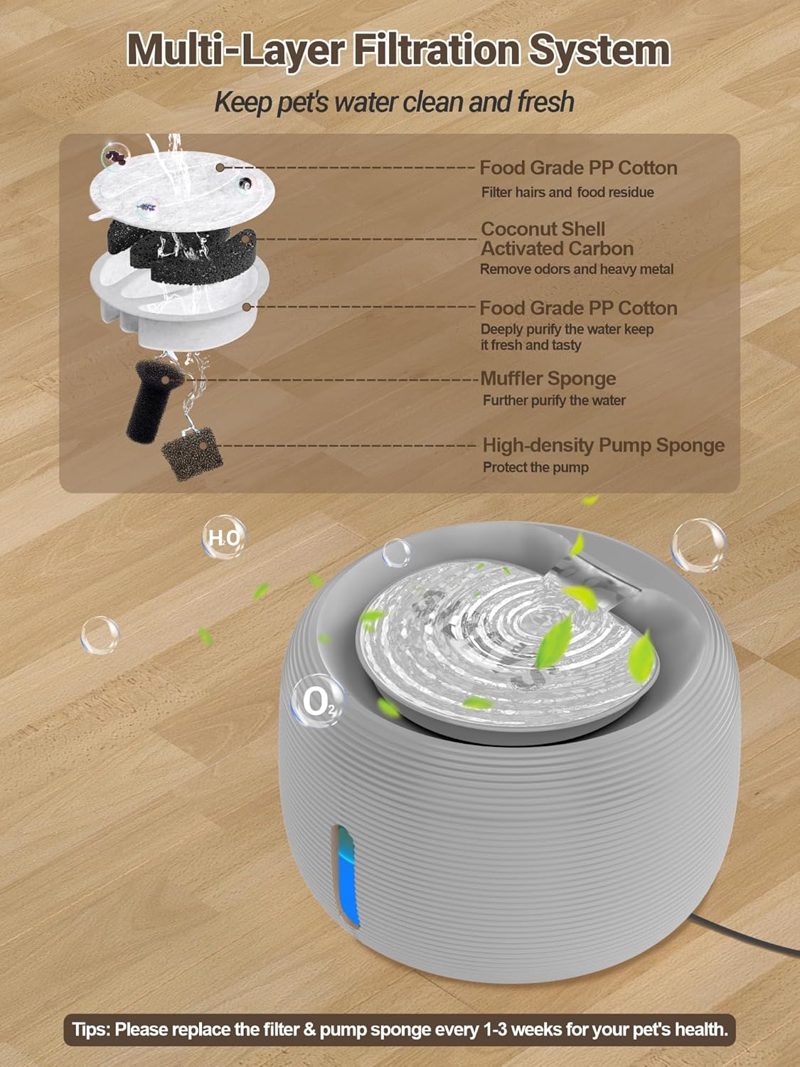 - 5-Layer Filtration: The water fountain with multi-layer filtration system can effectively remove hair, food residues, dust, odors, heavy metals from the water, providing clean and fresh water for your pets.