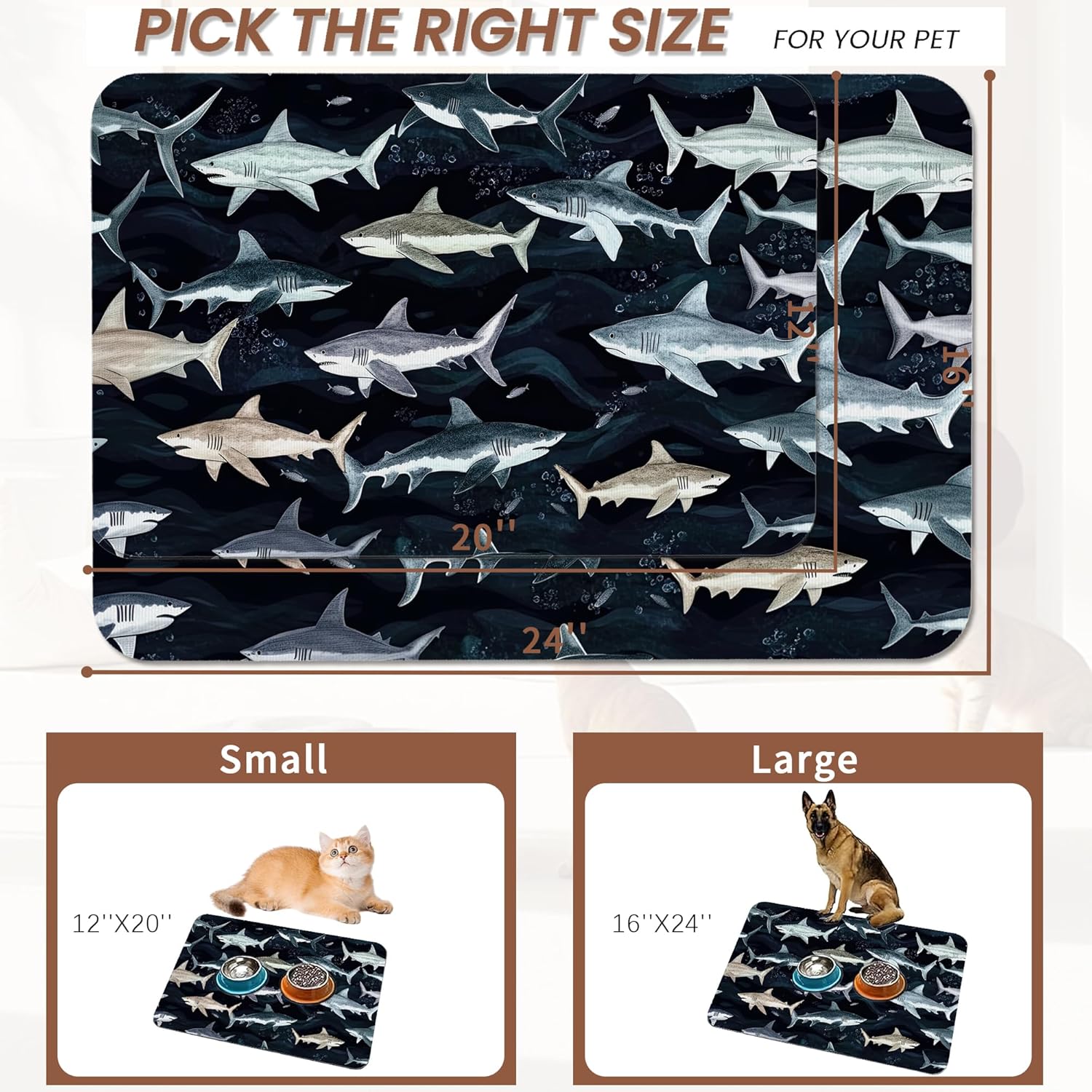 Cute Shark Dog Cat Food Mat,Absorbent Pet Feeding Mat with Rubber Backing,Non-Slip Water Bowl Placemat,Indoor Pet Accessories Supplies 12"x20"