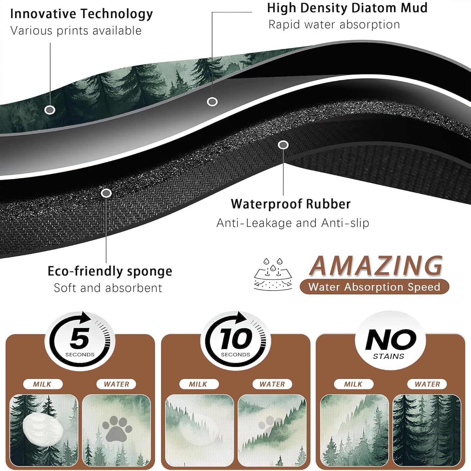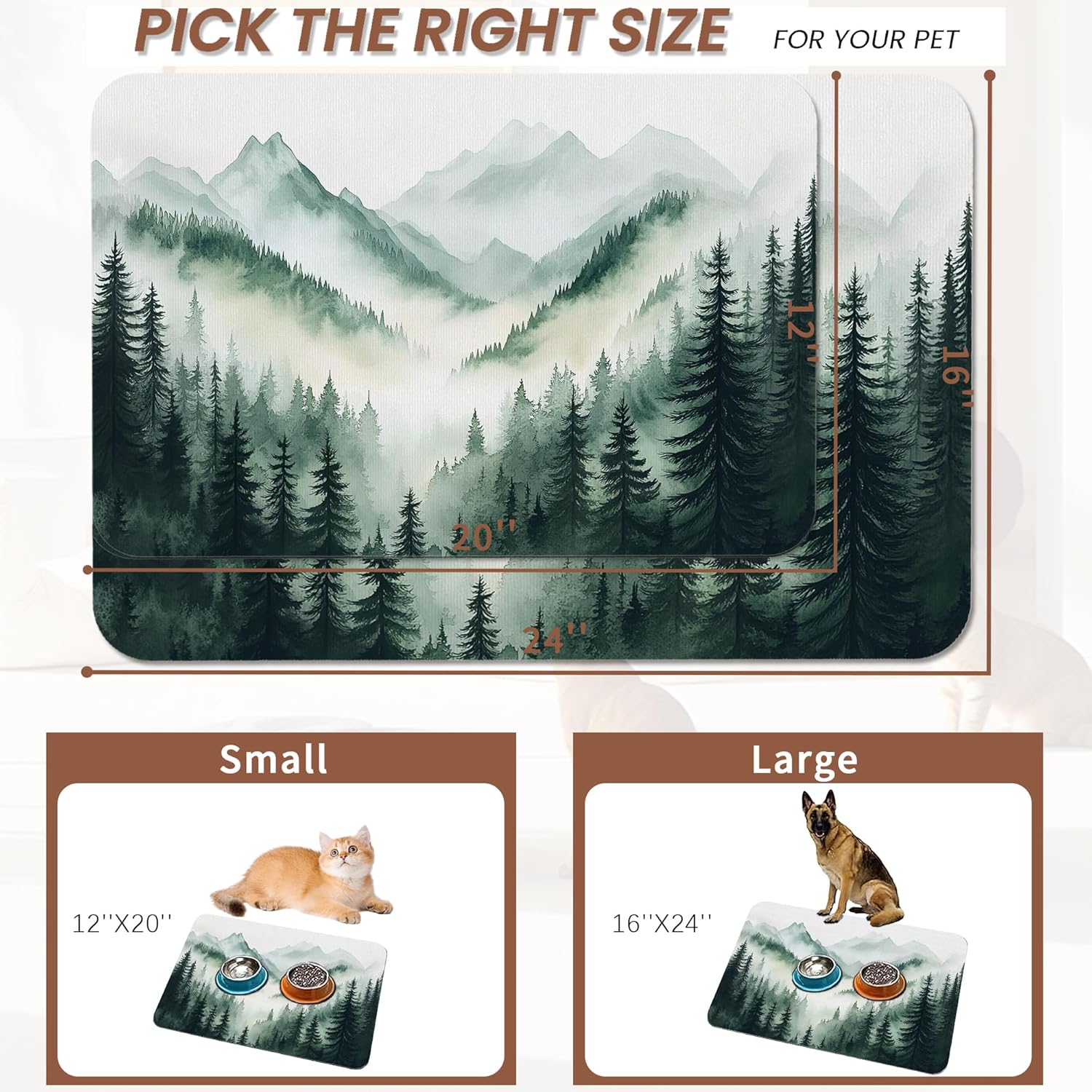 - Absorbent: This Misty Forest Mountain pattern pet food mat helps prevent liquid spills and keeps your pet's eating area clean, making it a practical addition to your pet supplies. It helps keep paws dry even for pets who love to drink water. The sturdy design is resistant to tearing and helps prevent accidental ingestion.