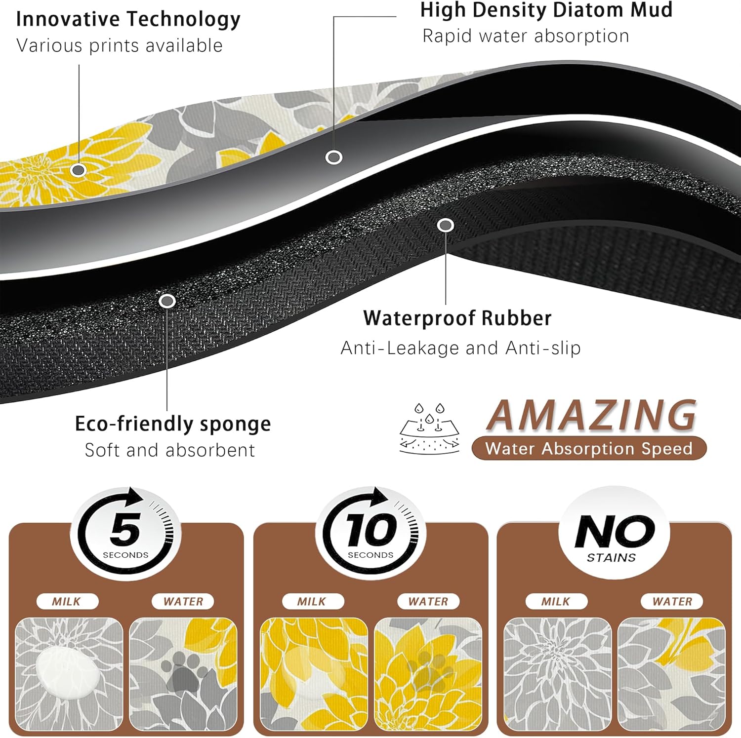 Dahlia Dog Cat Food Mat,Gray Yellow Flower Absorbent Pet Feeding Mat with Rubber Backing,Non-Slip Water Bowl Placemat,Indoor Pet Accessories Supplies 12"x20"