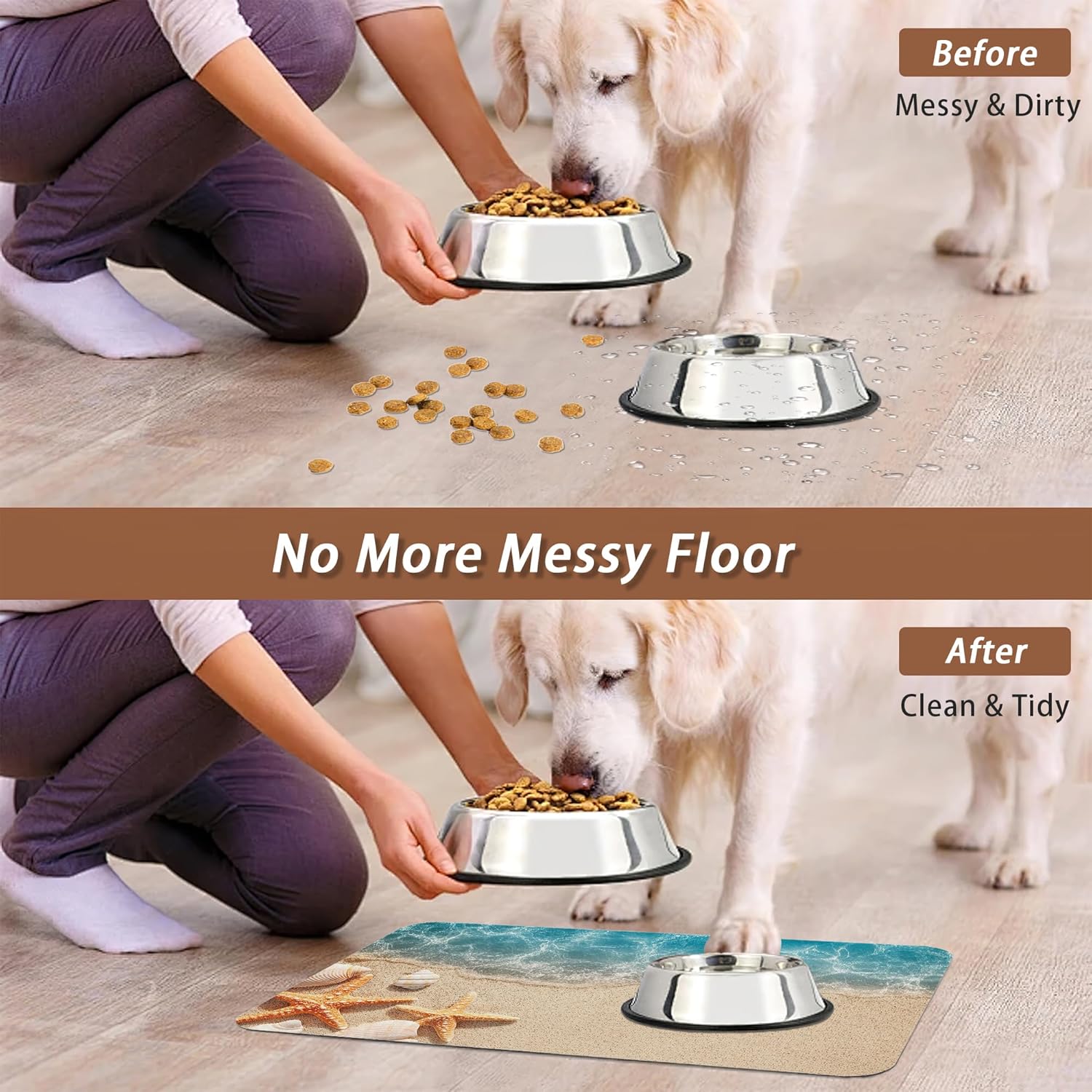 Beach Starfish Dog Food Mat for Floors,Cute Seashell Absorbent Pet Food and Water Bowl Mats,Non-Slip Pet Feeding Mat,Pet Supplies 16" x 24"