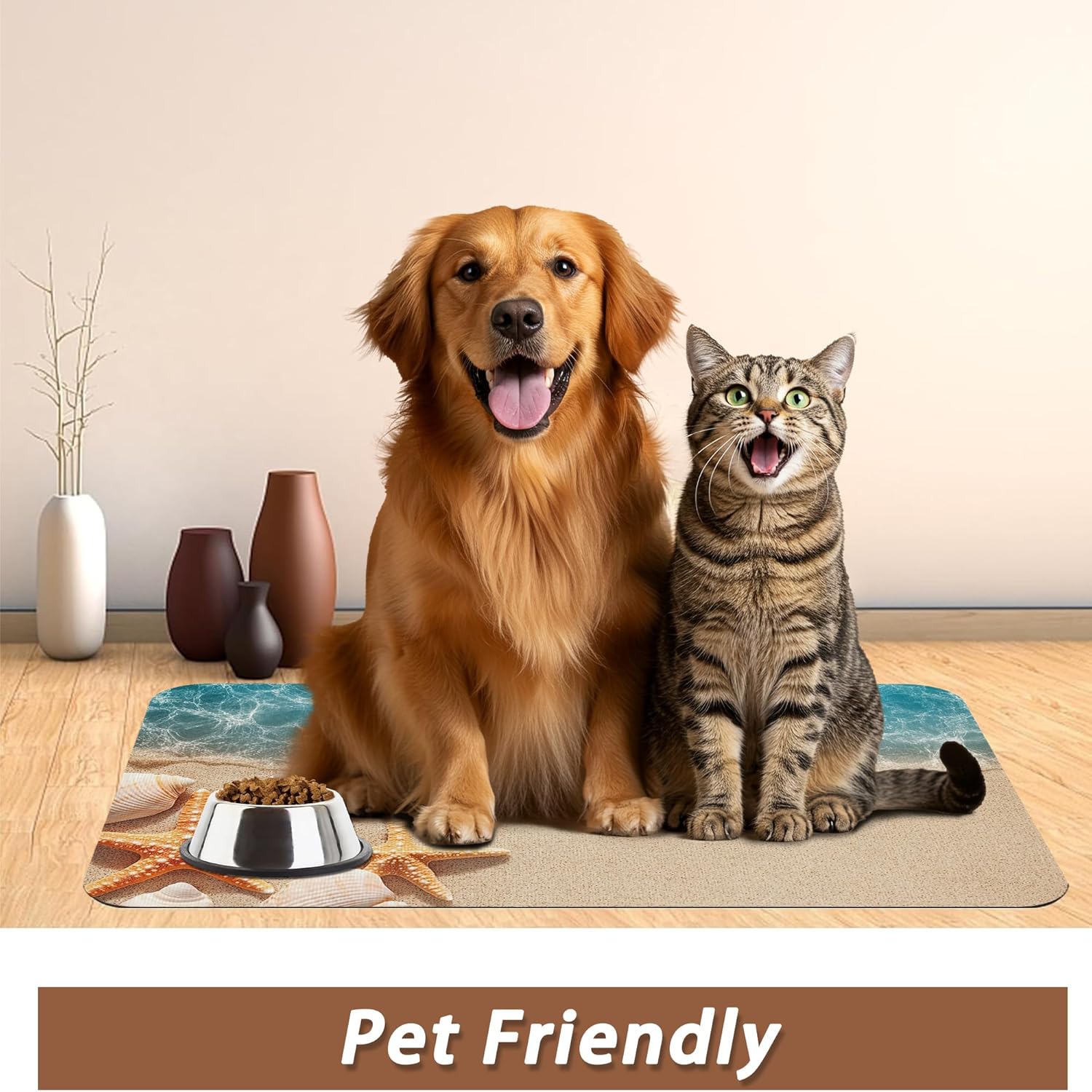 Beach Starfish Dog Food Mat for Floors,Cute Seashell Absorbent Pet Food and Water Bowl Mats,Non-Slip Pet Feeding Mat,Pet Supplies 12" x 20"
