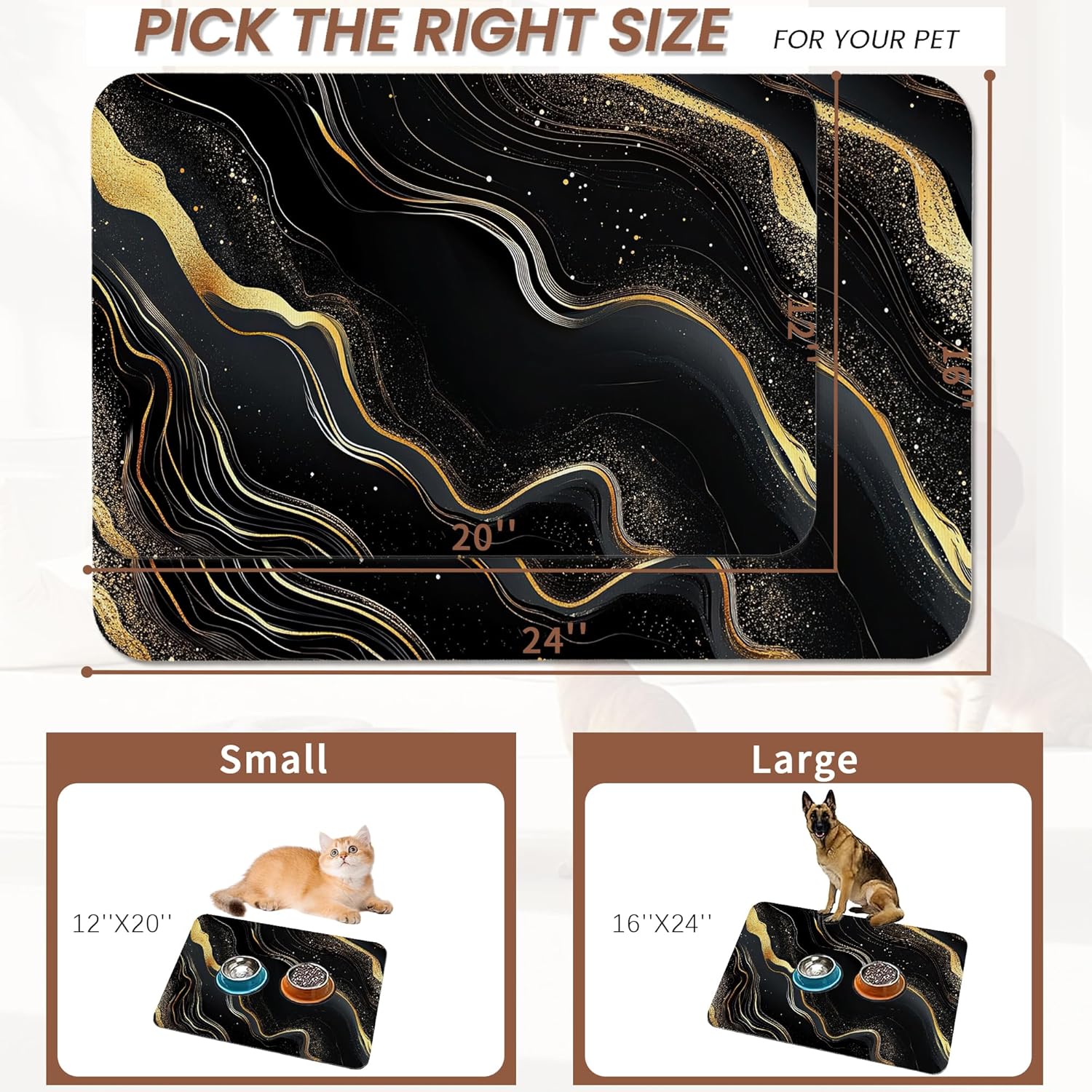 - Absorbent: This Black Gold Flowing Marble pattern pet food mat helps prevent liquid spills and keeps your pet's eating area clean, making it a practical addition to your pet supplies. It helps keep paws dry even for pets who love to drink water. The sturdy design is resistant to tearing and helps prevent accidental ingestion.