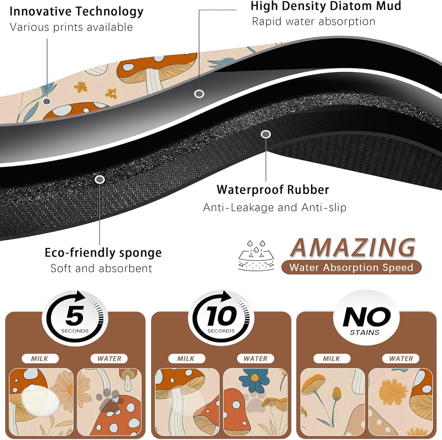 Cute Mushroom Flower Dog Cat Food Mat,Absorbent Pet Feeding Mat with Rubber Backing,Non-Slip Water Bowl Placemat,Indoor Pet Accessories Supplies 16"x24"