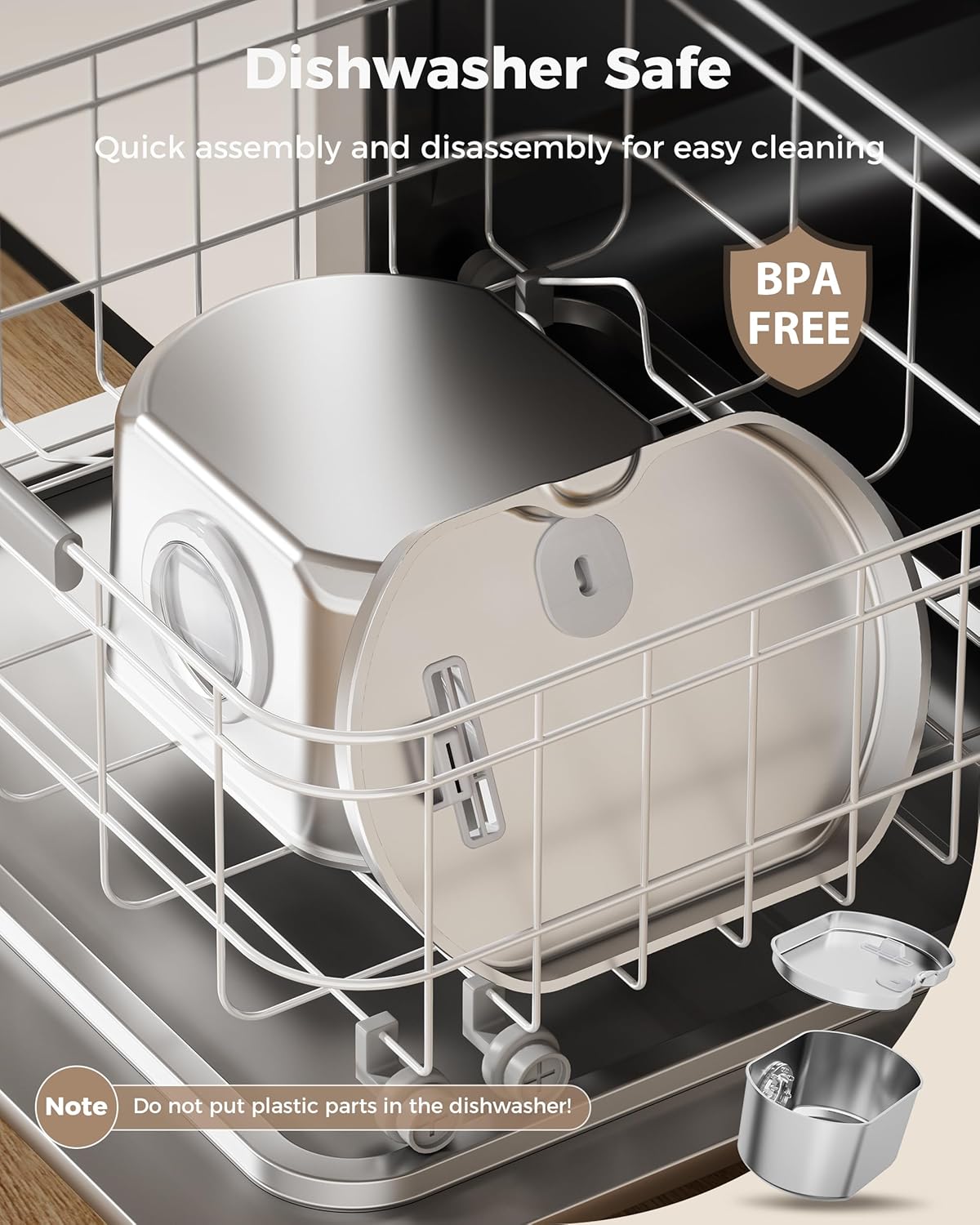 - Water Level Window & Stainless Steel: Our new design features a water level window, allowing you to effortlessly keep an eye on water levels without ever having to remove the cover of the cat fountain. Crafted from premium 304 stainless steel, it's not only corrosion-resistant but can also withstand high-temperature cleaning, ensuring your pet's health and safety
