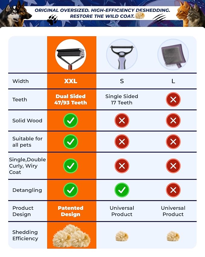 - â°ăQuick and Efficient GroomingăSave time with our versatile grooming tool. The dual-sided design features a wide-tooth side for tackling tough mats and a fine-tooth side for deshedding and thinning, making grooming faster and easier.