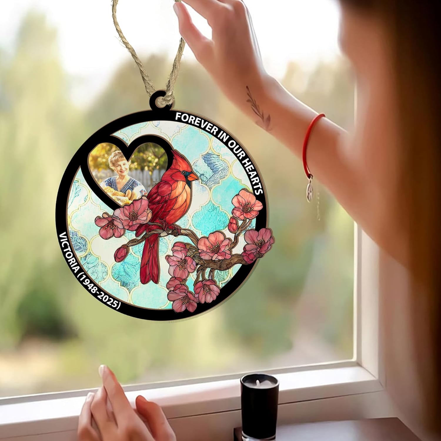 - PERSONALIZED CARDINAL MEMORIAL WITH PHOTO FRAME This heartfelt window suncatcher features a vivid red cardinal perched on cherry blossoms and a heart-shaped photo cutout for a loved one’s picture. Add a name, years (e.g., 1948–2025), and comforting message like “I’m Always With You.”