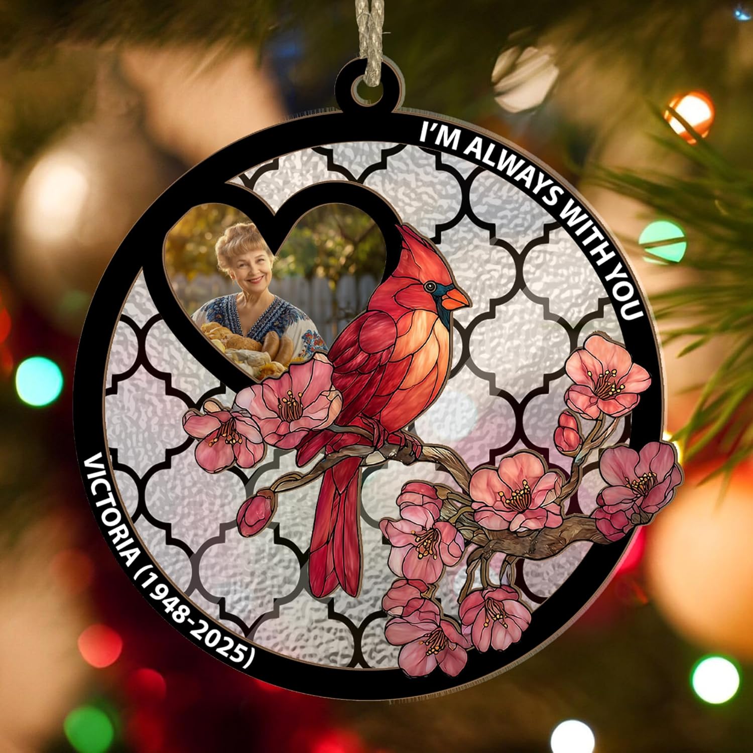 Personalized Cardinal Window Suncatcher Memorial Ornament – Custom Photo Remembrance Gift with Cherry Blossoms, “I’m Always with You” Quote – Cardinal Suncatchers for Windows, Car Mirror, or Display