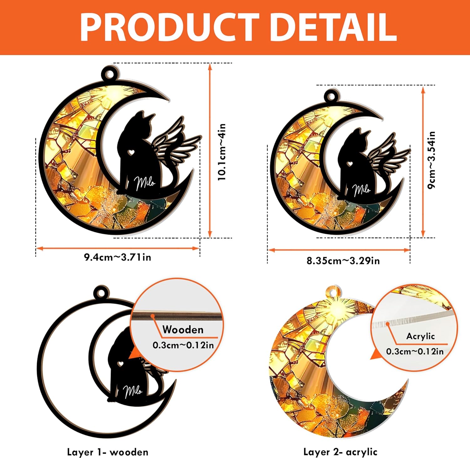 - CELESTIAL CAT MEMORIAL ORNAMENT WITH PERSONAL TOUCH This crescent moon cat memorial suncatcher honors your beloved feline with elegance and warmth. Featuring an angel-winged cat silhouette, heart cutout, and custom name (e.g., “Simba”), it offers light, love, and healing for pet parents mourning a loss.